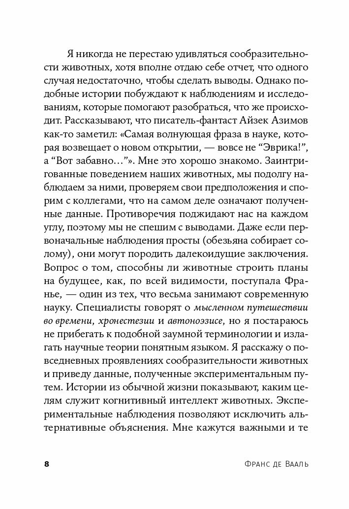 Интереснейшая книга, главная тема которой - показать, насколько разнообразными и выдающимися познавательными способностями обладают животные разных видов, и что глупо считать человеческие способности мерой всех вещей, ведь другие животные готовы предложить что-то свое, не менее уникальное. Здесь и исследование памяти и моделирования будущего у животных, и исследования социальных взаимоотношений, взаимопомощи и альтруизма, и даже политических решений среди животных. Очень много увлекательной и неожиданной информации, полученных из самых последних исследований в области этологии! Франс Де Вааль пишет очень увлекательным и доступным языком, советую именно эту книгу для первого знакомства с этим ученым.