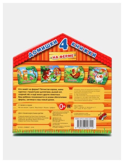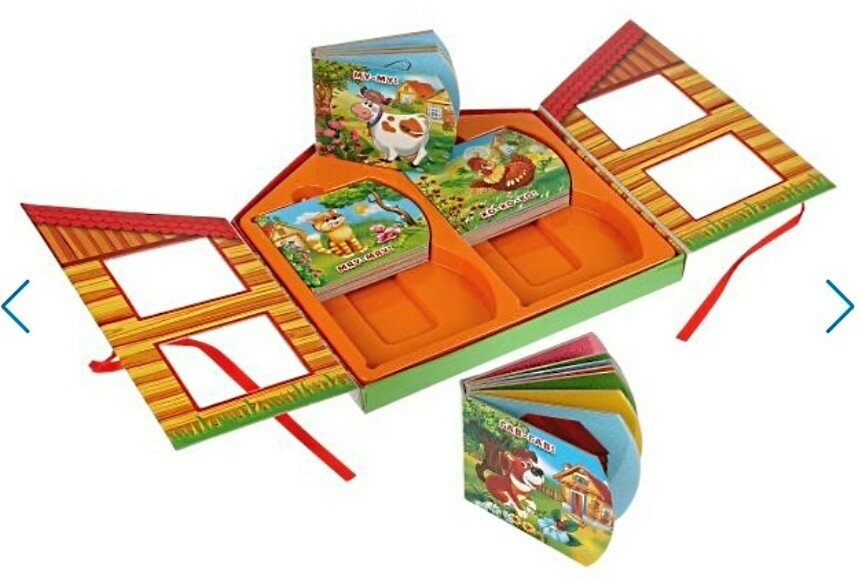 Домишки - 4 книжки. На ферме станет прекрасным подарком для вашего ребёнка! В волшебном домике собраны четыре ярко иллюстрированные книжки, которые помогут малышу начать увлекательное знакомство с окружающим миром. Развяжите бантик и откройте дверцы, на этажах поселились жители фермы. Кто живёт на ферме? Пятнистая корова, мама курочка с пушистыми цыплятами, рыжий кот, озорной пёс и много других животных. Можно устроить весёлый переезд и поменять их этажами. Удобный формат книжек позволяет взять их с собой в домике или по отдельности. Особенности: - коробка-домик; - дверцы на ленточке; - 4 познавательные книжки; - яркие иллюстрации; - толстые страницы. Замечательные книжки будут первыми помощниками в изучении форм, цифр, цветов и первых слов. ... дальше " Развивают: - визуальное и цветовое восприятие; - тактильные навыки; - внимание. Рекомендовано детям с раннего ясельного возраста.
