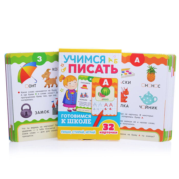 Набор развивающих карточек "Учимся писать" познакомит ребенка с буквами русского алфавита, поможет освоить печатное написание букв, развить зрительно-моторную координацию и подготовить руку к письму.