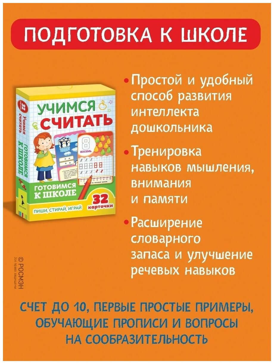 Учимся считать (Развивающие карточки. Готовимся к школе 5+) (Купряшова Светлана Н. (иллюстратор), Евдокимова А.В. (редактор), Саввушкина Татьяна А. (иллюстратор)); РОСМЭН, 2019