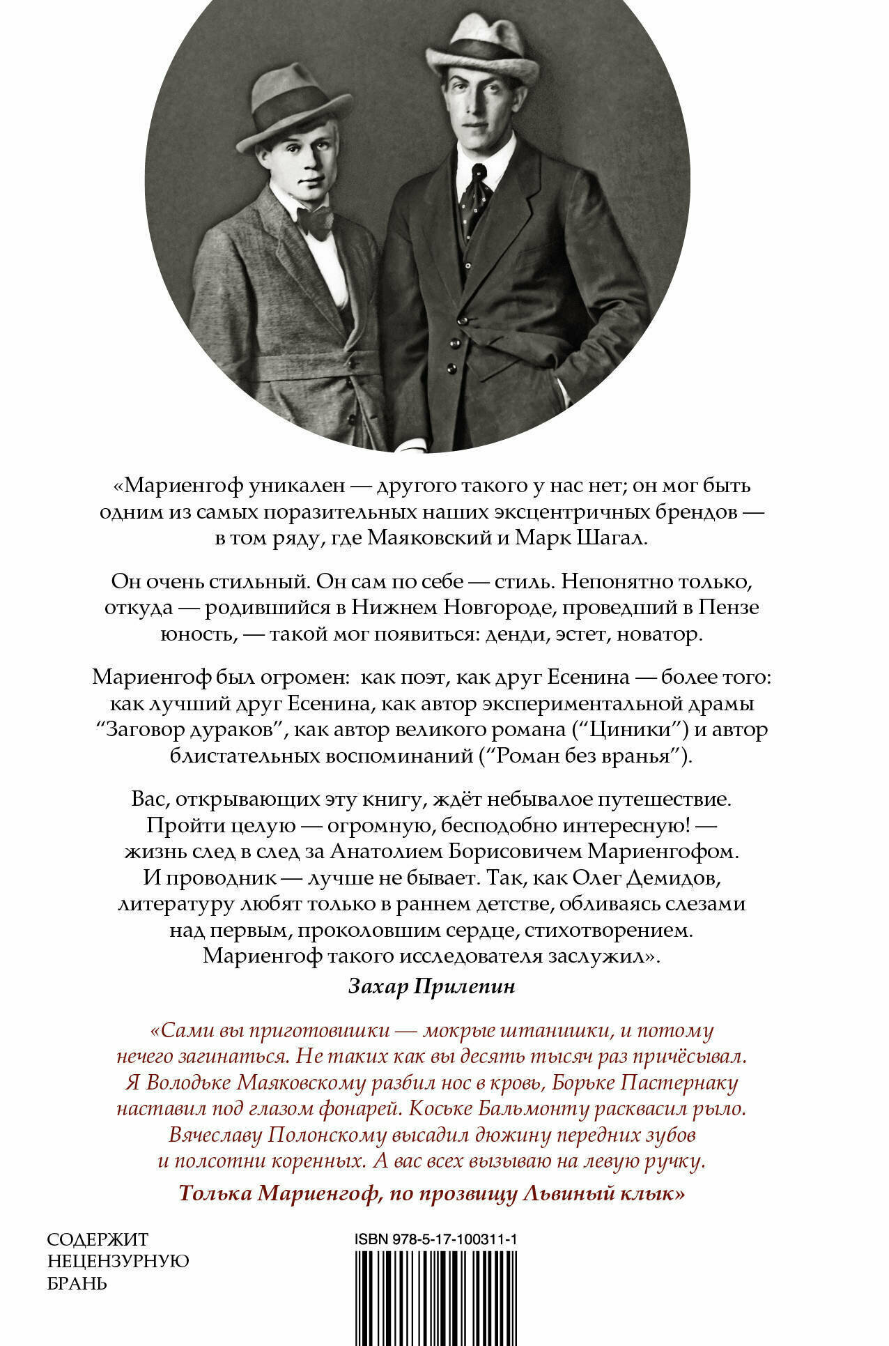 Не маловажное замечание Захар Прилепин сделал в предисловии к книге – «интерес к Мариенгофу в наши дни постоянный и стойкий, но не массовый». Почему так? Бешеная популярность имажинизма в 20-е годы, «Заговор дураков», «Циники», чуть позже – «Шут Балакирев». Наверное, правда, он «расхотел быть первым» – талантище, стильный красавец, эстет, новатор.