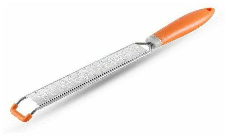 Терка узкая для крупной стружки WERNER STRETTO 50070 , 34см. Толщина: 0,25мм. Терка небольшого размера зачастую требуется на кухне, чтобы натереть небольшое количество ингредиентов в блюдо. Теркой удобно измельчать продукты в тарелку или непосредственно над пищей перед подачей. Ею можно натереть такие продукты, как шоколад, цедра, ферментированные фрукты и овощи, сыры твёрдых и мягких сортов, гриб трюфель. Благодаря опоре на основании, можно не опасаться, что терка соскользнет во время работы.