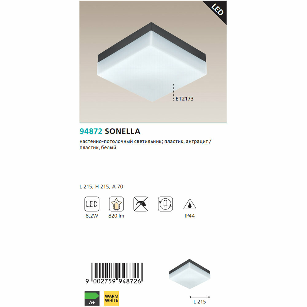 Потолочный светильник светодиодный уличный Sonella - продукт известной компании Eglo (Австрия). Имеет максимальную мощность 8.2 Вт, освещает площадь до 2 кв. м. Отлично подойдет для таких мест, как веранда и беседка. Впишется в интерьеры следующих стилей: современный, минимализм.