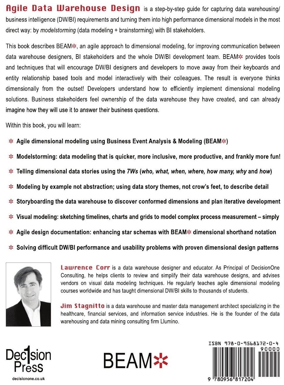 This book describes BEAM✲, an agile approach to dimensional modeling, for improving communication between data warehouse designers, BI stakeholders and the whole DW/BI development team. BEAM✲ provides tools and techniques that will encourage DW/BI designers and developers to move away from their keyboards and entity relationship based tools and model interactively with their colleagues. The result is everyone thinks dimensionally from the outset! Developers understand how to efficiently implement dimensional modeling solutions. Business stakeholders feel ownership of the data warehouse they have created, and can already imagine how they will use it to answer their business questions.