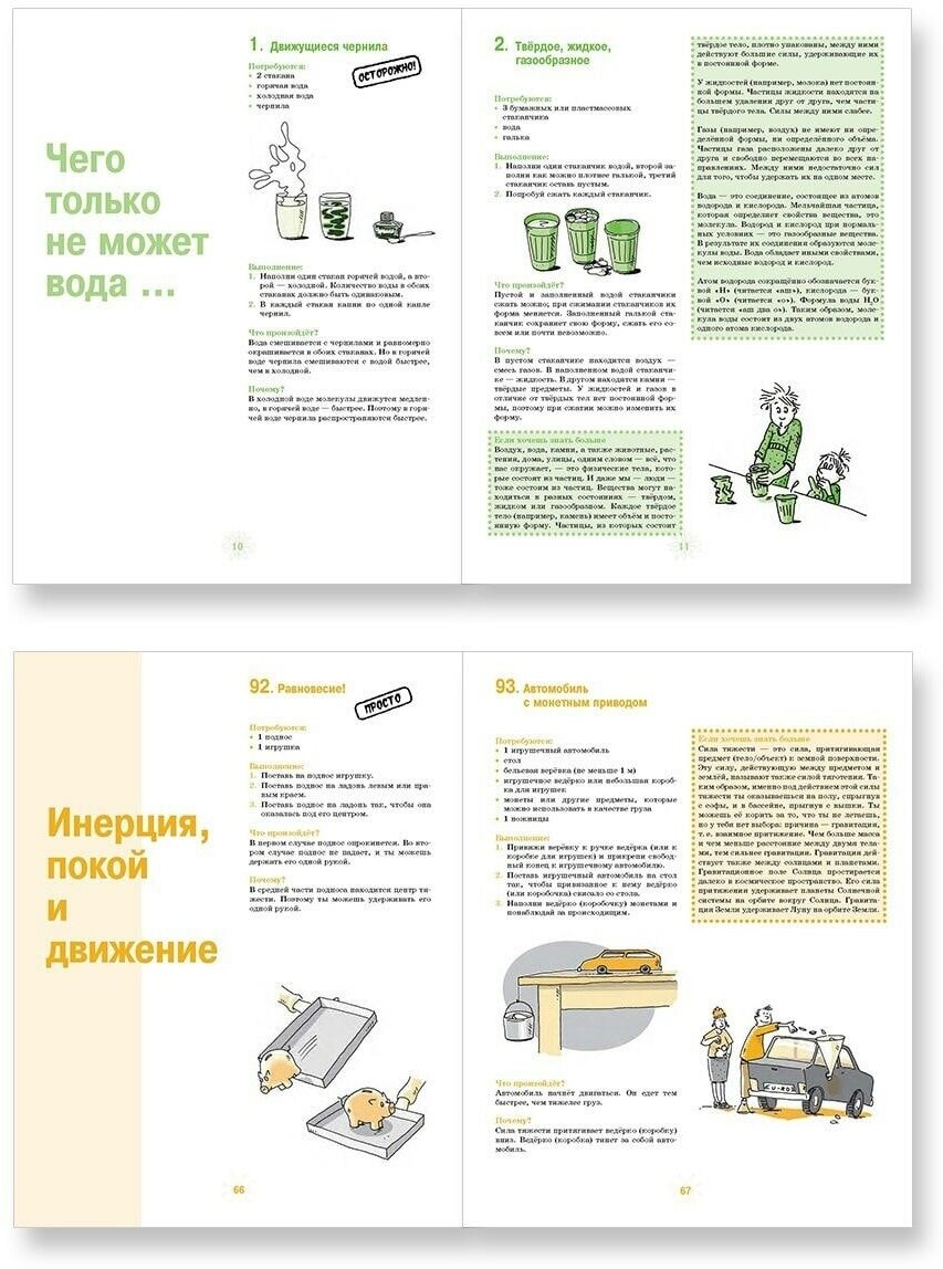 Некоторые эксперименты дополнены познавательными текстами, раскрывающими более подробно наблюдаемые явления. Для экспериментов используются простые, безопасные и доступные материалы, которые есть почти в каждом доме.