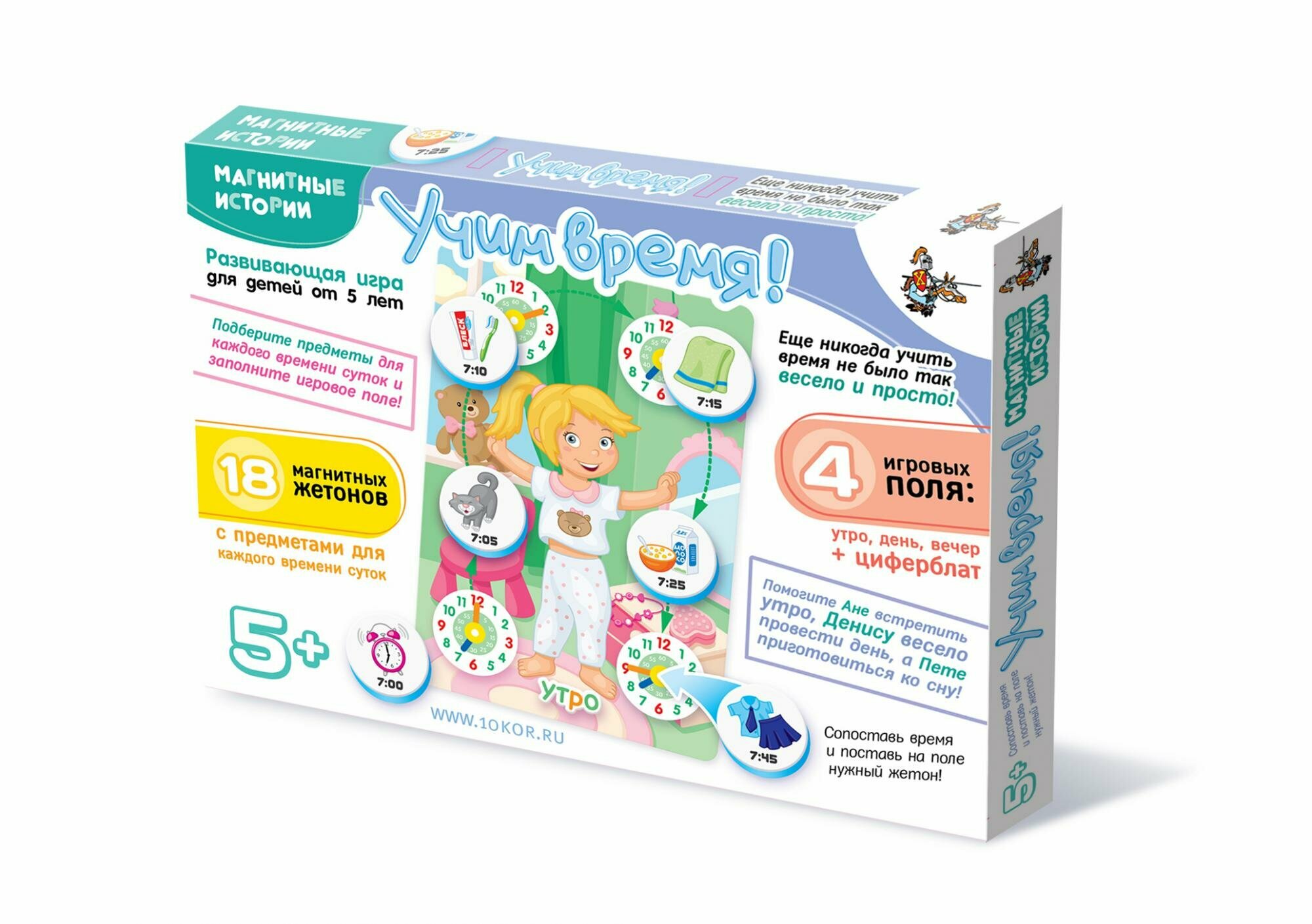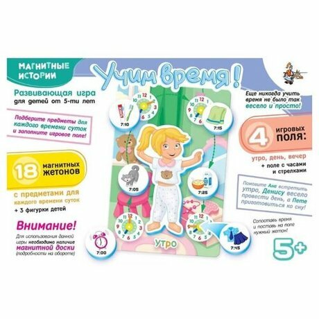 Развивающая игра Учим время научит детей определять время, пользуясь часами, а также соотносить распорядок дня по времени суток. Для этого в наборе есть 4 игровых поля, 3 фигурки персонажей Ани, Дениса и Пети, 18 магнитных жетонов с предметами и указанным на них временем, относящимся к определенному моменту суток. Для игры потребуется магнитная доска, которой может стать любая металлическая поверхность.