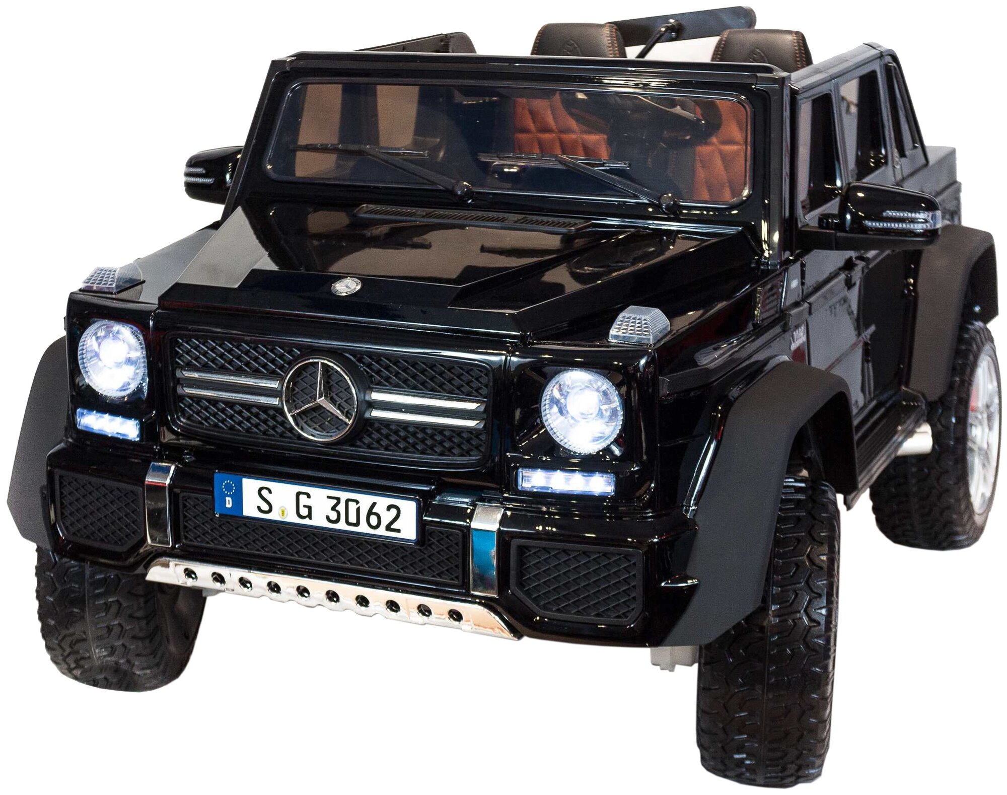 Детский электромобиль выполнен по аналогии с известной моделью автомобиля - Mercedes-Benz Maybach G650 AMG с открытым багажником. Внутри уместятся 2 ребенка, есть удобные, отодвигаемые от руля сиденья с кожаными чехлами, ремнями безопасности и высокими подголовниками, руль смещен в левую сторону. Колеса резиновые, дополнены пружинными амортизаторами, декоративными дисками и широкими покрышками с рельефными протекторами. Энергоемкие аккумуляторы долго держат заряд, а 4 двигателя отвечают за развитие скорости до 7 км/ч (всего 3 скорости вперед и одна назад). Для переключения скоростей необходимо плавно нажимать на педаль или кнопки пульту управления из комплекта, позволяющего родителям на расстоянии контролировать электромобиль. Двери открываются, в салоне есть имитация приборной панели, кнопка для активации зажигания, руль с музыкальными эффектами (мелодии, клаксон) и разъемы для подключения внешних носителей (Aux/SD/USB).