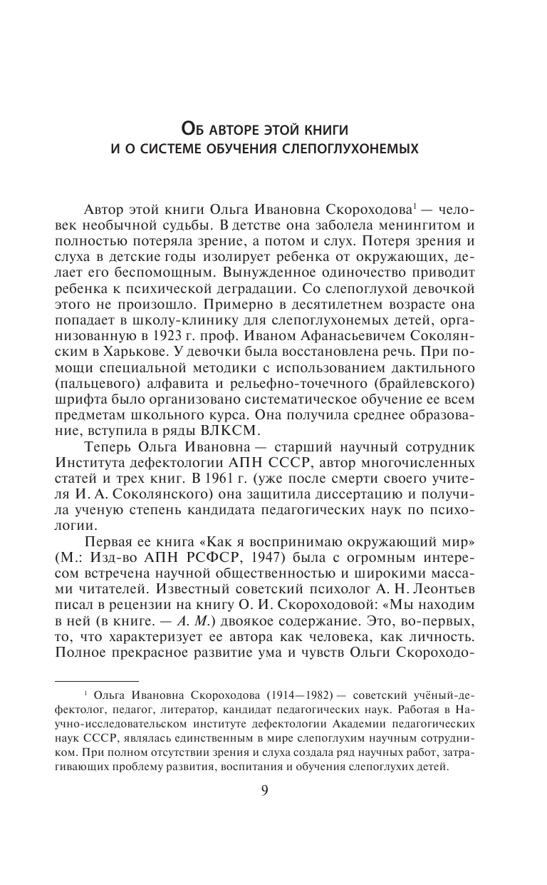 Когда я училась в Герцена на факультете Коррекционной педагогики кафедре Тифлопедагогика нам рассказывали про эту книгу, но вот незадача - достать ее было не реально на тот момент. Почему-то все время "допечатали тираж, вот-вот будет". Можно было в библиотеке взять, что, собственно, и случилось, но это не то - хотелось ТАКУЮ книгу иметь у себя. И, вот оно, счастье. Наконец-то. Рекомендую всем, она заслуживает того, чтобы вы ее прочитали. Иметь профильное образование, как у меня, не нужно. Написано очень доступным, простым языком. Будьте готовы погрузиться в другую реальность. Ведь для этого не нужна ни машина времени, ни портал, ни тарелка НЛО, а просто погрузиться в ощущения и восприятия слепого и глухого (речь была несколько восстановлена в последствии) человека и понять...А что понять? Знаете, каждый понимает и выносит из книги что-то свое, нужное ему. Я поняла, прямо таки ощутила всей своей шкурой, что надо жить и радоваться этой жизни, не смотря на все неприятности и проблемы, которые имеют место быть. Ведь есть люди ("особые" как нас учили говорить), которые тоже живут и радуются этой жизни не смотря ни на что.