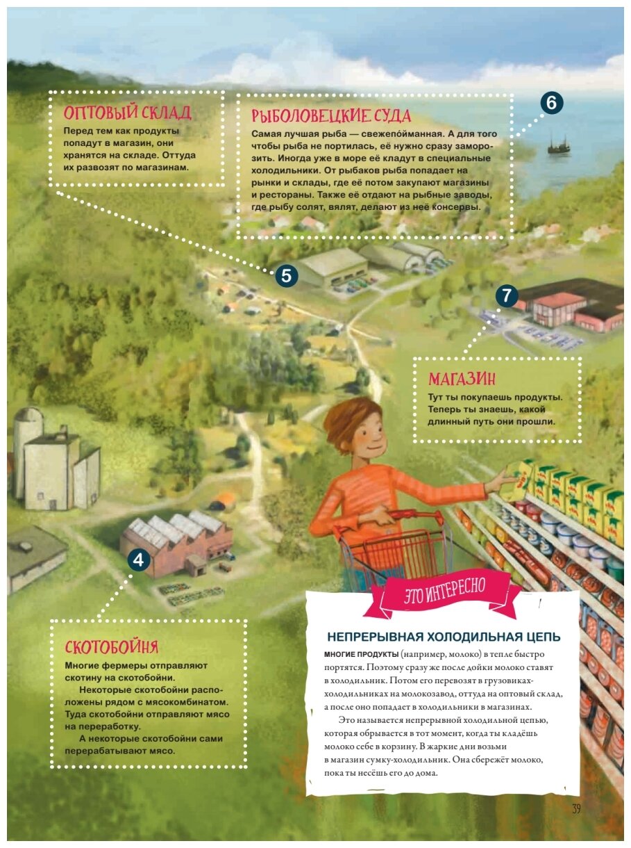 И точно такой же комплексный подход автор книги использует, когда пишет о нашей с вами жизни на этой Земле. Мы так привыкли жить в комфорте, что уже и не задумываемся, откуда что берется. А здесь, пожалуйста, все очень подробно, доходчиво, с потрясающими иллюстрациями изложено. Причем очень неглупым текстом, порой даже сам поражаешься, что ты уже столько лет прожил на свете, а таких вещей не знал. Мне даже кажется, что многие страницы из этой книги могли бы послужить отличным материалом, например, на уроках физики в нашей школе - по темам электричество или как устроен электродвигатель, или даже как работает наш холодильник, да много чего еще! (Это все равно что как с помощью книг про Флавию де Люс Алана Брэдли можно пробудить интерес к химии, у любого, даже совершенно далекого от науки человека.)Просто так гораздо интереснее, когда теория дается не в отрыве от практики, а на конкретных примерах. Ребенок прочитает и пусть даже он еще не ходит в школу, голова у него заработает как надо. Потому что то, о чем написано в книге, он видит каждый день, но после прочтения на все будет смотреть совершенно по-другому, более вдумчиво и внимательно. А самое главное - начнет бережней относиться к окружающему его миру. Потому что в этой энциклопедии после каждой темы (Еда, Транспорт, вода и т.д.) автор пишет о том, как та или иная сфера жизни человека отражается на окружающей среде и дает простые и эффективные рекомендации как нам эту среду сберечь. И кстати, читаешь эту книгу и поражаешься насколько далеко шагнул прогресс в Скандинавии по части очистки воды, утилизации и переработки мусора. А как же шведы бережно относятся к лесу! Прочитаешь про семенные насаждения, про питомники, где выращиваются молоденькие елочки и сосенки и поразишься - боже, а наша тайга! Она, конечно, велика, но как же по-варварски мы ее вырубаем, совершенно не задумываясь о том, что будет после нас.