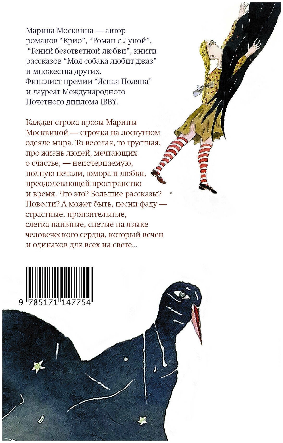 Марина Москвина – автор романов “Крио”, “Роман с Луной”, “Гений безответной любви”, книги рассказов “Моя собака любит джаз” и множества других. Финалист премии “Ясная Поляна” и лауреат Международного Почетного диплома IBBY. Каждая строка прозы Марины Москвиной – строчка на лоскутном одеяле мира. То веселая, то грустная, про жизнь людей, мечтающих о счастье, – неисчерпаемую, полную печали, юмора, удивительных приключений и любви, преодолевающей пространство и время. Что это? Большие рассказы? Повести? А, может быть, песни фаду – страстные, пронзительные, слегка наивные, спетые на языке человеческого сердца, который вечен и одинаков для всех на свете…