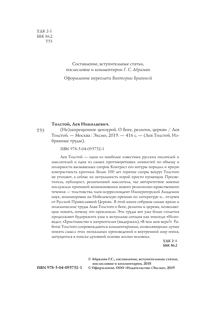 Лев Толстой - один из наиболее известных русских писателей и мыслителей и одна из самых противоречивых личностей по объему и полярности вызываемых споров. Контраст его натуры породил и яркую контрастность критики. Более 100 лет горячие споры вокруг Толстого не утихают, а сейчас их актуальность порой просто пугающая. Просветитель, публицист, религиозный мыслитель, чье авторитетное мнение послужило причиной возникновения нового религиозно-нравственного течения - толстовства, член-корреспондент Императорской Академии наук, номинирован на Нобелевскую премию по литературе и … отлучен от Русской Православной Церкви. В этой книге собраны самые яркие и полемические труды Льва Толстого о Боге, религии и церкви, позволяющие понять, почему это произошло. Эти труды вот уже более столетия продолжают будоражить умы и актуальны сегодня как никогда: "Исповедь", "Христианство и патриотизм" (выдержки), "В чем моя вера?".