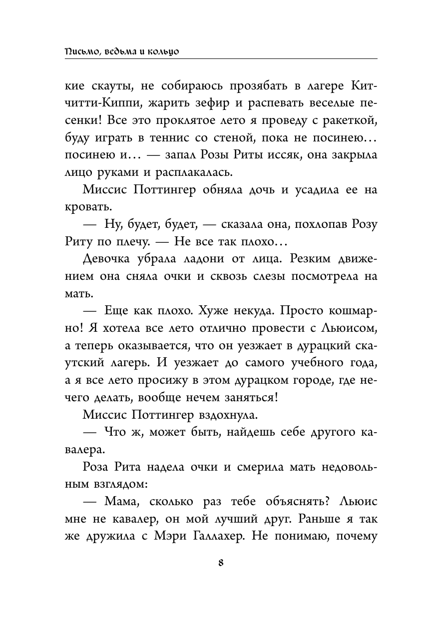 Заинтересовала обложка данной книги, поэтому не задумываясь решила заказать. Читается очень легко и весьма интересно. Тоненькая и лёгкая, крупный шрифт. Самое интересное, что в начале каждой главы есть сверху маленький рисунок, говорящий о том, что (возможно) будет в этой главе. Также среди глав можно увидеть и просто обычные рисунки, очень милые. Для ребенка подойдёт сто процентов, если он любит магию, волшебство и тайны, то эта книга точно не оставит ребенка равнодушным.