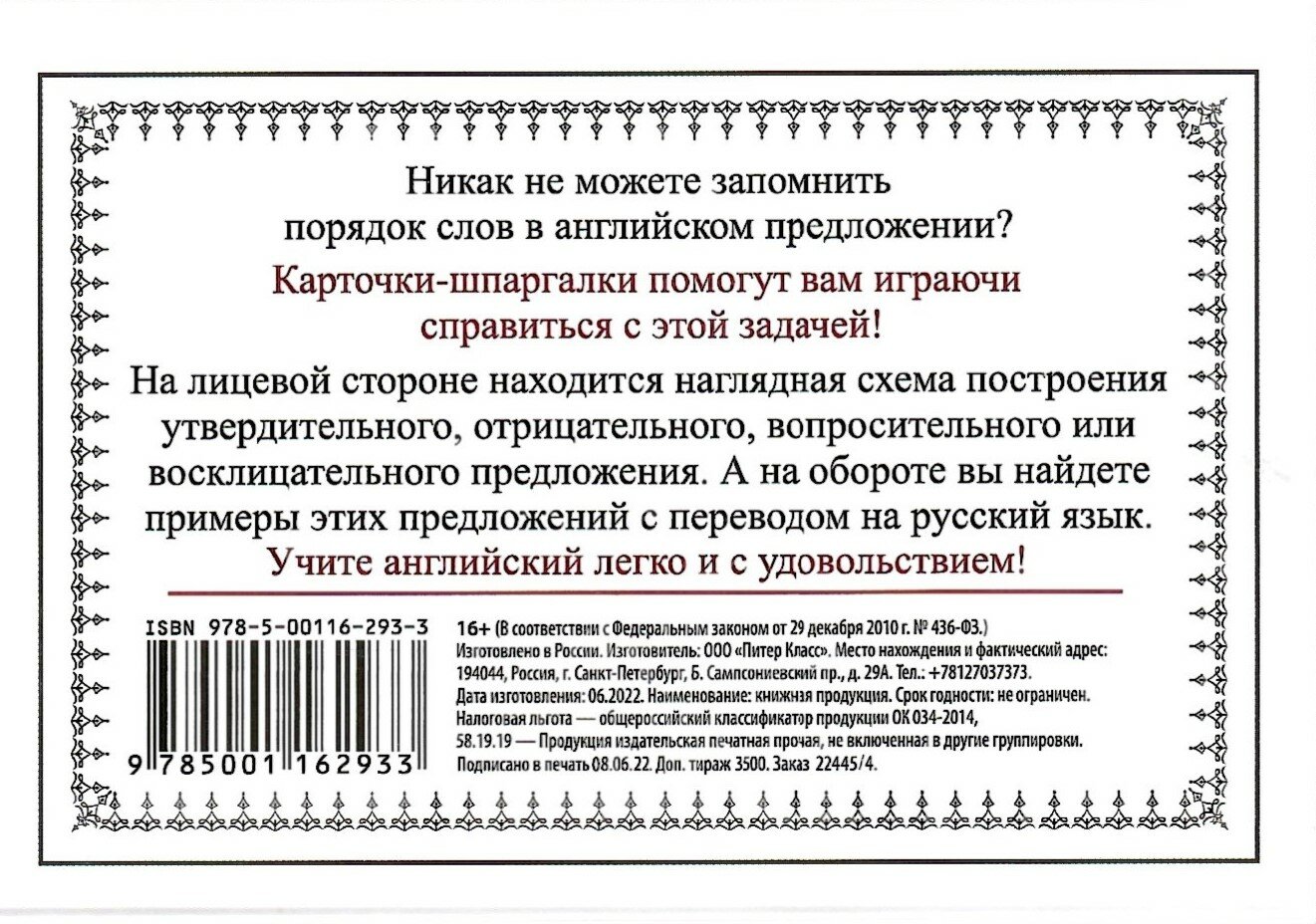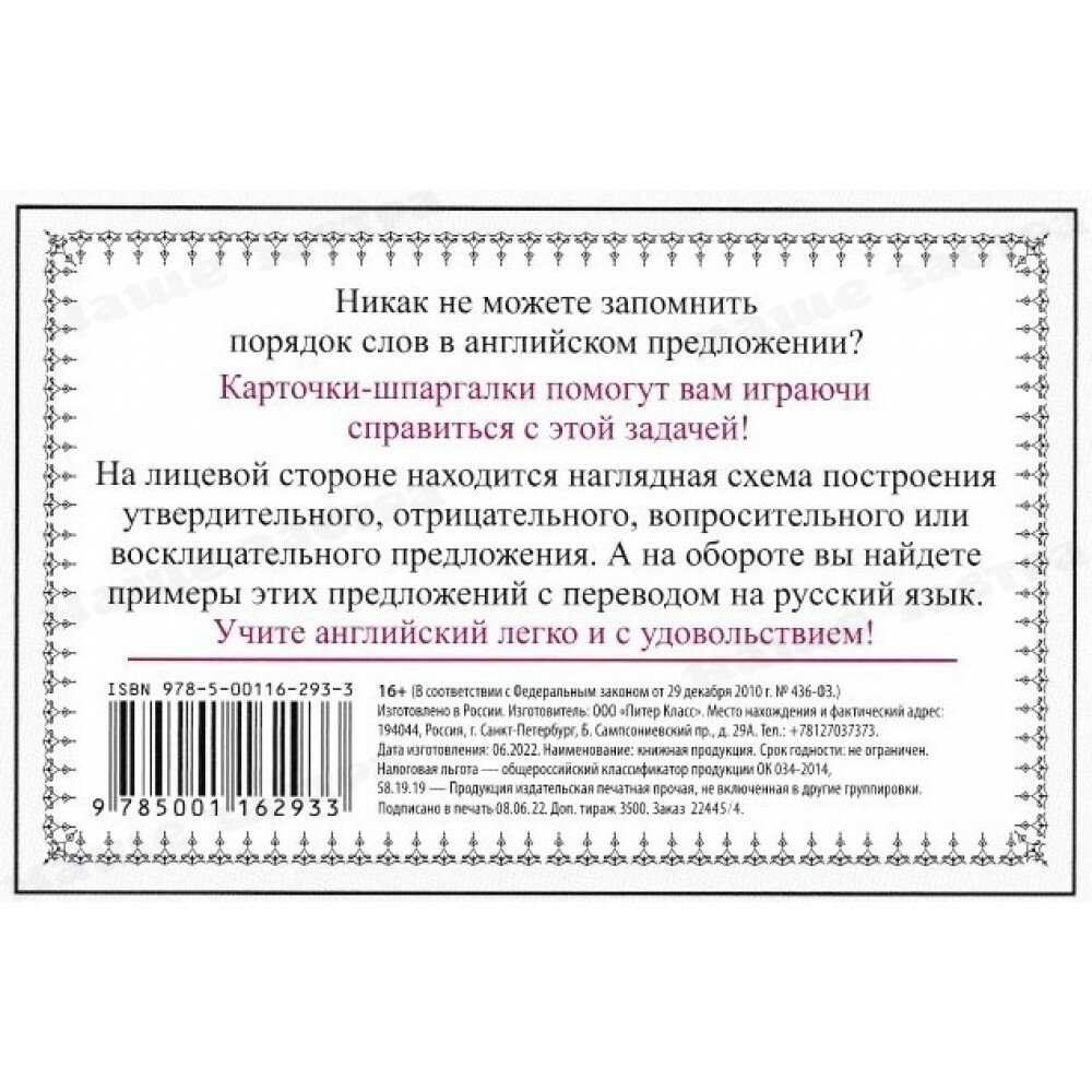 Никак не можете запомнить порядок слов в английском предложении? Карточки-шпаргалки помогут вам играючи справиться с этой задачей! На лицевой стороне находится наглядная схема построения утвердительного, отрицательного, вопросительного или восклицательного предложений. А на обороте вы найдете примеры этих предложений с переводом на русский язык. Учите английский легко и с удовольствием!