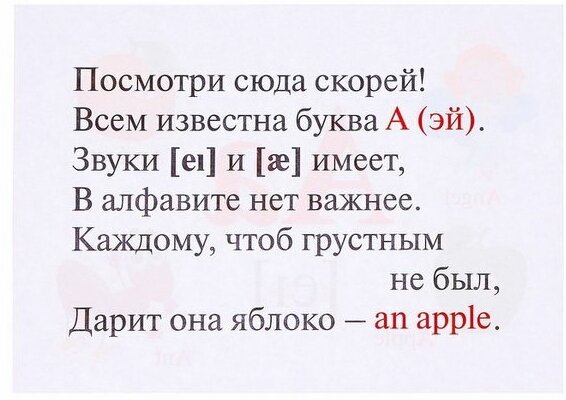 Развивающие карточки "Английский алфавит" в увлекательной форме познакомят детей с буквами английского алфавита и правилами чтения. Стихи помогут ребенку легко и доступно, а главное - с удовольствием выучить английский алфавит и расширить словарный запас на английском языке. В комплект входит 32 карточки: из них 26 карточек с буквами английского алфавита, где на лицевой стороне карточки красочное изображение буквы, её транскрипции и слов с картинками, начинающиеся на эту букву, на оборотной стороне - стихотворение; 6 карточек с правилами чтения букв и фонетическими упражнениями. Комплект карточек предназначен педагогам и родителям для занятий с детьми.