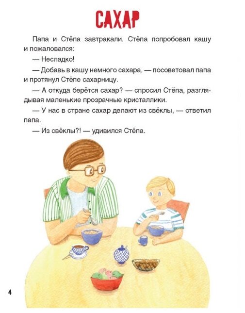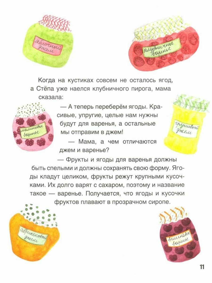 Мама или папа рассказывают Стёпе, как делают сахар, джем и варенье, желе, зефир и пастилу, шоколад, халву и откуда берётся мёд. Рассказики о каждом продукте небольшие, но очень информативные. Отличный русский язык. Много картинок. Дополнительная фишка - лабиринты в виде труб на производстве или веток с яблоками на дереве. Ещё есть рецепт приготовления домашней шоколадной пасты. Для детей 5-7 лет отличная книга.
