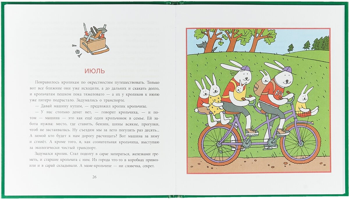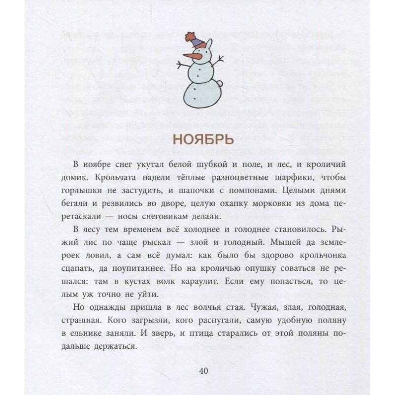 В книге двенадцать (по числу месяцев в году) миленьких и добрых сказочек. С удовольствием прочитали с моим шестилетним племянником. Через эти сказки ребёнок познакомился с обитателями леса. Узнал, с кем из лесных жителей дружат кролики, а кого надо бояться и держаться от них подальше. Понял, что друг другу нужно делать добро, делиться, помогать друзьям. Даже волку, который их поначалу выращивал, чтобы съесть, когда их станет побольше, помогли. Ведь он их спасал от хитрого лиса, росомахи и целой стаи серых волков, которые нанесли ему рану. Приютили, вылечили рану и устроили на работу, чтобы не умер с голоду.