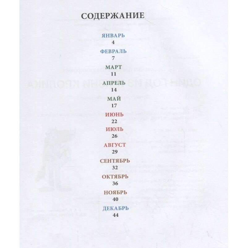 "Один год из жизни кролика" - цикл смешных и добрых рассказов о жизни молодой семьи кроликов и их многочисленных крольчатах. У Алексея Лисаченко и Анны Реутовой получилась книжка-календарь (ведь крольчата прибавляются каждый месяц!), смешная и добрая, в любой момент в нее можно заглянуть и улыбнуться. Здесь друг всегда поддержит в трудную минуту, любимое дело обязательно принесет плоды, семья будет опорой и даже, казалось бы, злой и страшный Волк сможет стать защитником и добрым товарищем.
