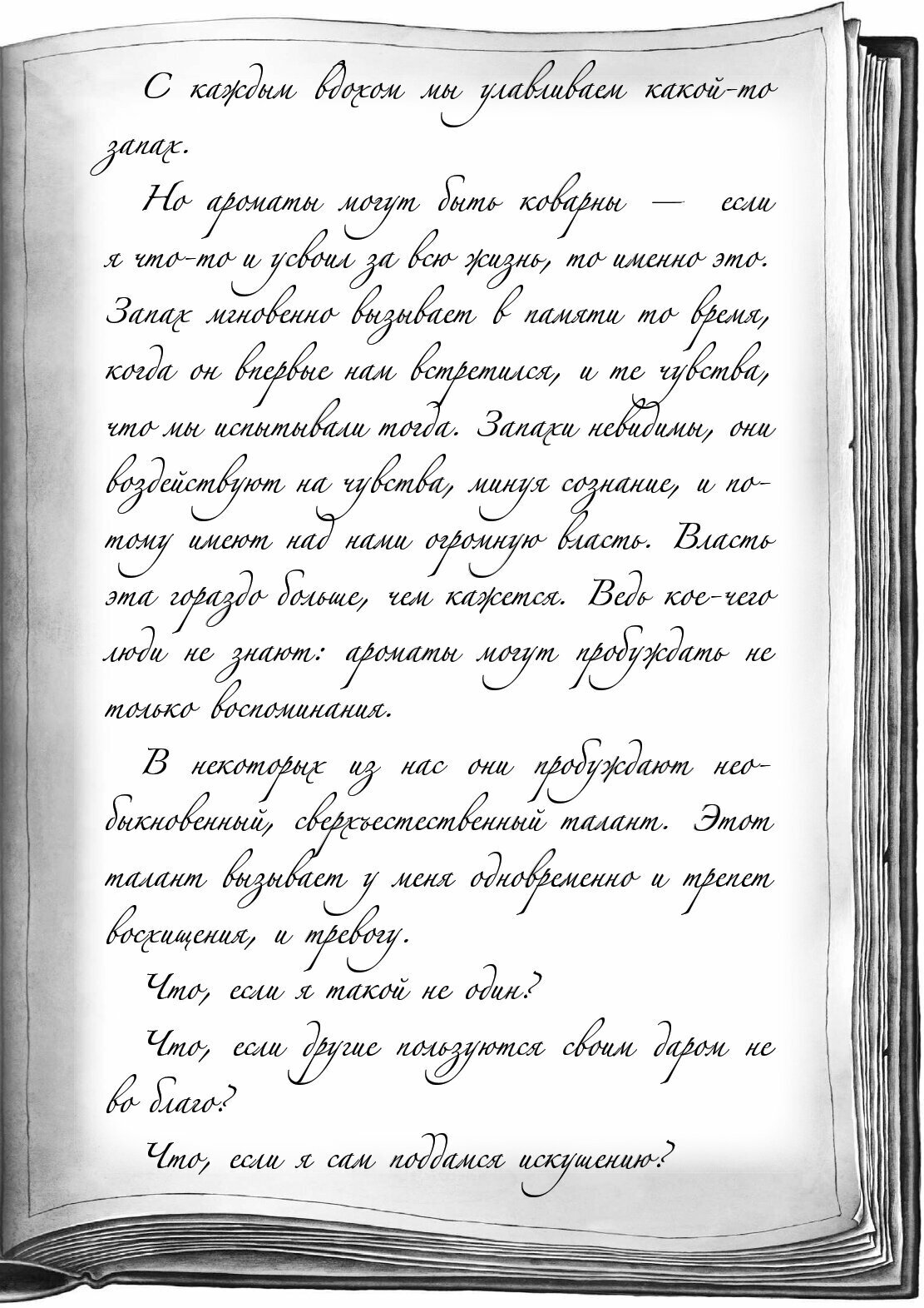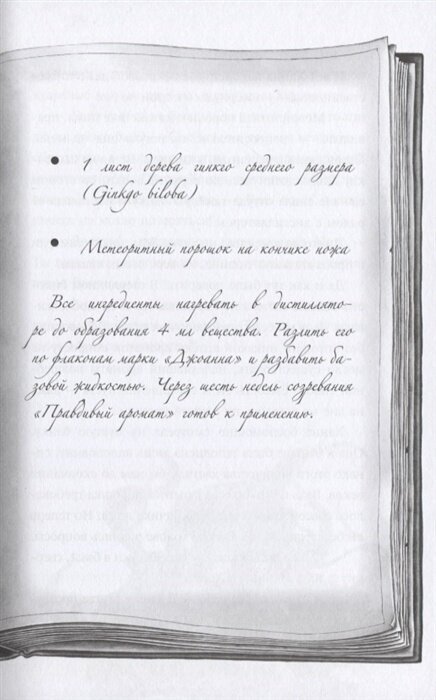 Книга очень красива оформлена, иллюстрация на обложке очень притягательная, есть цветная вклейка с ароматами, много черно-белых рисунков. Все настраивает на нужный лад. Шрифт крупный, бумага во второй части плотная, белейшая.