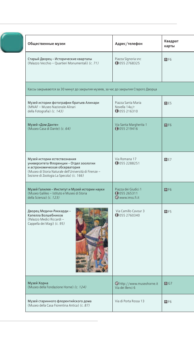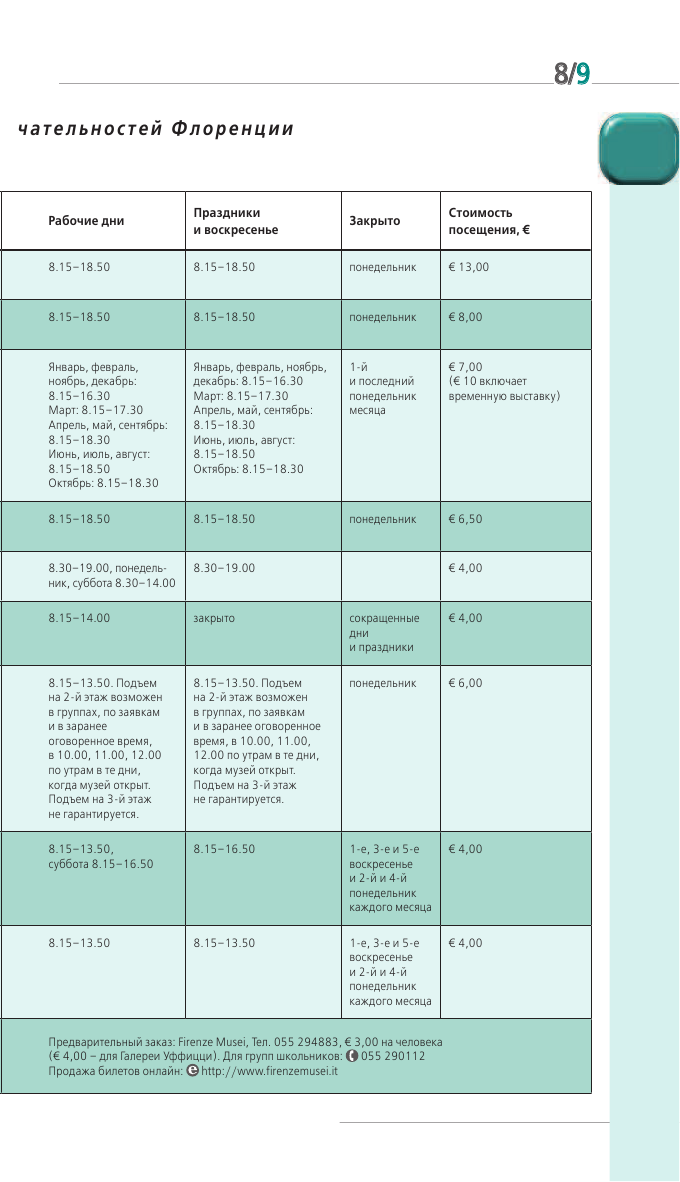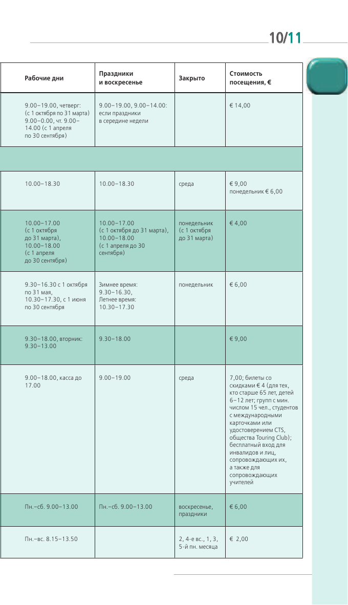 3.отдельная таблица,посвященная времени работы музеев,других достопримечательностей и стоимости входных билетов