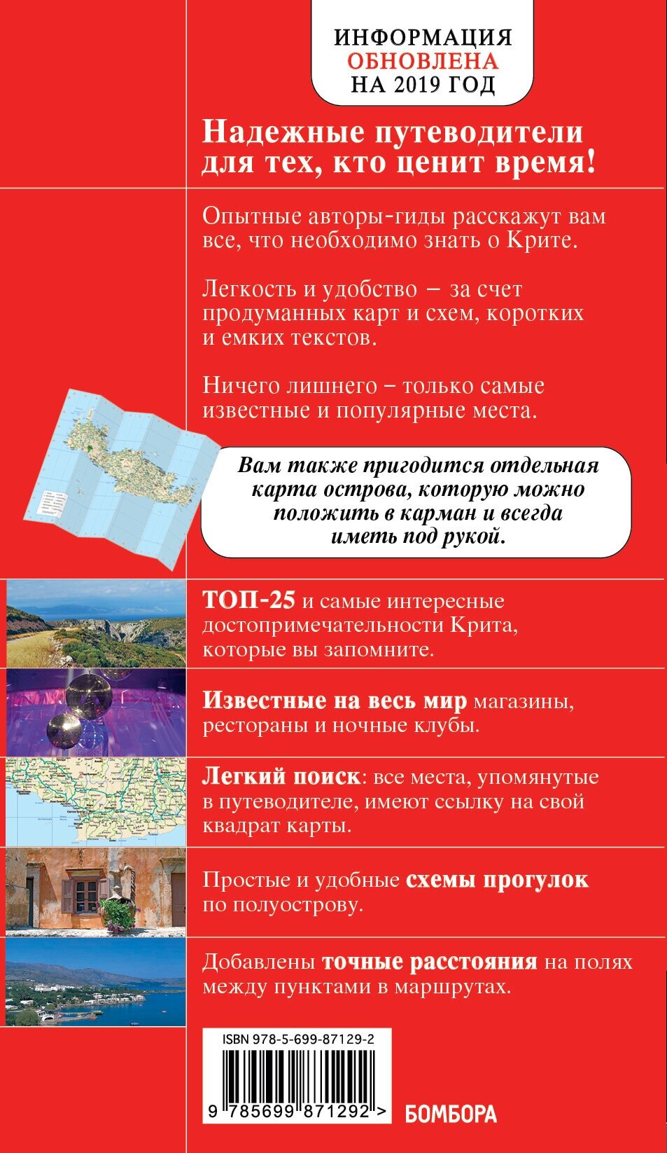 Я приобрела себе данный путеводитель по Криту, поскольку у меня уже было несколько книг из серии "Оранжевый гид". Как я поняла, разница в сериях в том, что в "Красных гидах" информация дана в более сжатом виде. В целом по этому гиду можно составить представление о достопримечательностях острова, выбрать то, что наиболее интересно, а более подробную информацию по самым интересным местам искать в интернете. Книга удобна тем, что она компактная и легкая, легко поместится в дамскую сумочку. Есть адреса и телефоны ресторанов, музеев, достопримечательностей, магазинов. Возле названий ресторанов отмечена категория цен, можно выбрать то, что по карману. Указаны цены на входные билеты в некоторые музеи. Карта острова неплохая, посмотрим, как она себя оправдает на месте! В целом, я могу рекомендовать данный путеводитель тем, кто в первый раз едет на Крит.
