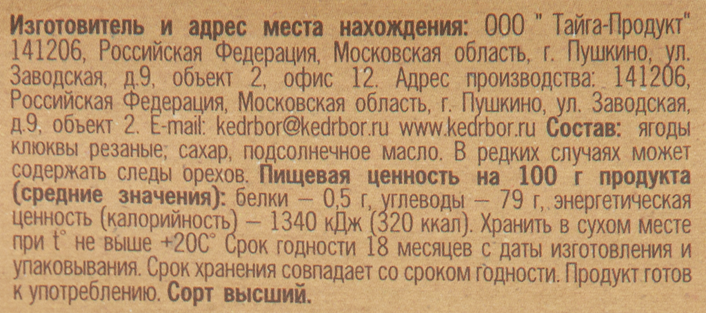 | Состав | ягоды клюквы сушеные резаные, сахар |