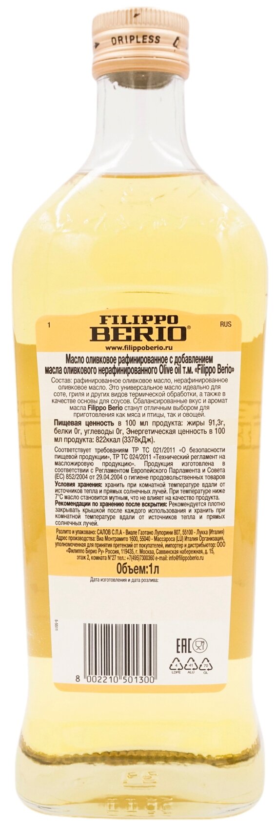 Масло оливковое Filippo Berio рафинированное c добавлением нерафинированного стеклянная бутылка 1 л
