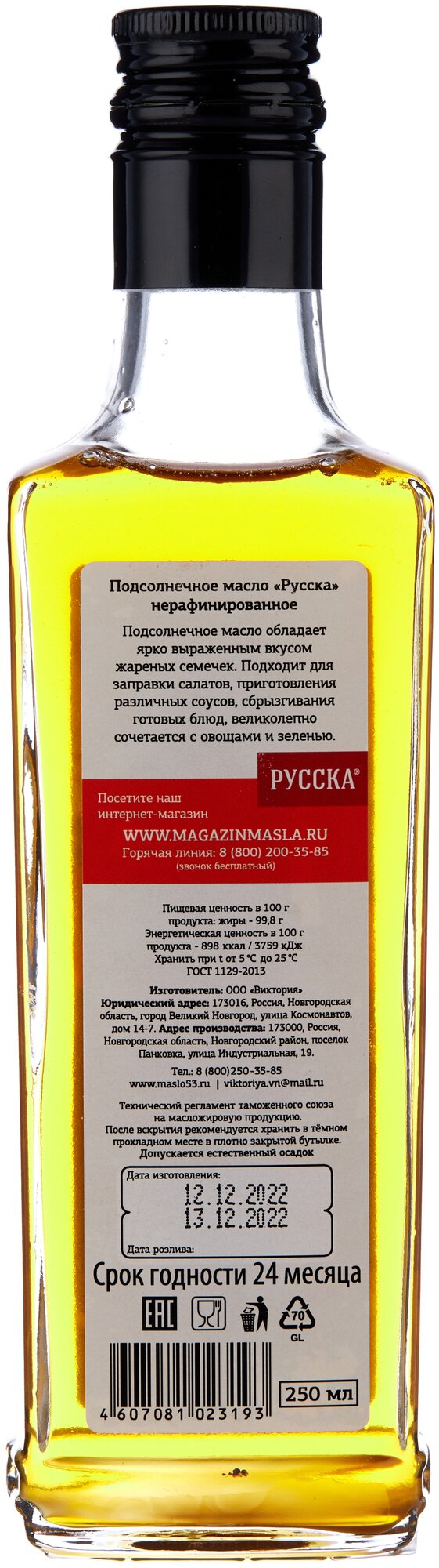 | Состав | Подсолнечное нерафинированное масло из обжаренных семян подсолнуха. |