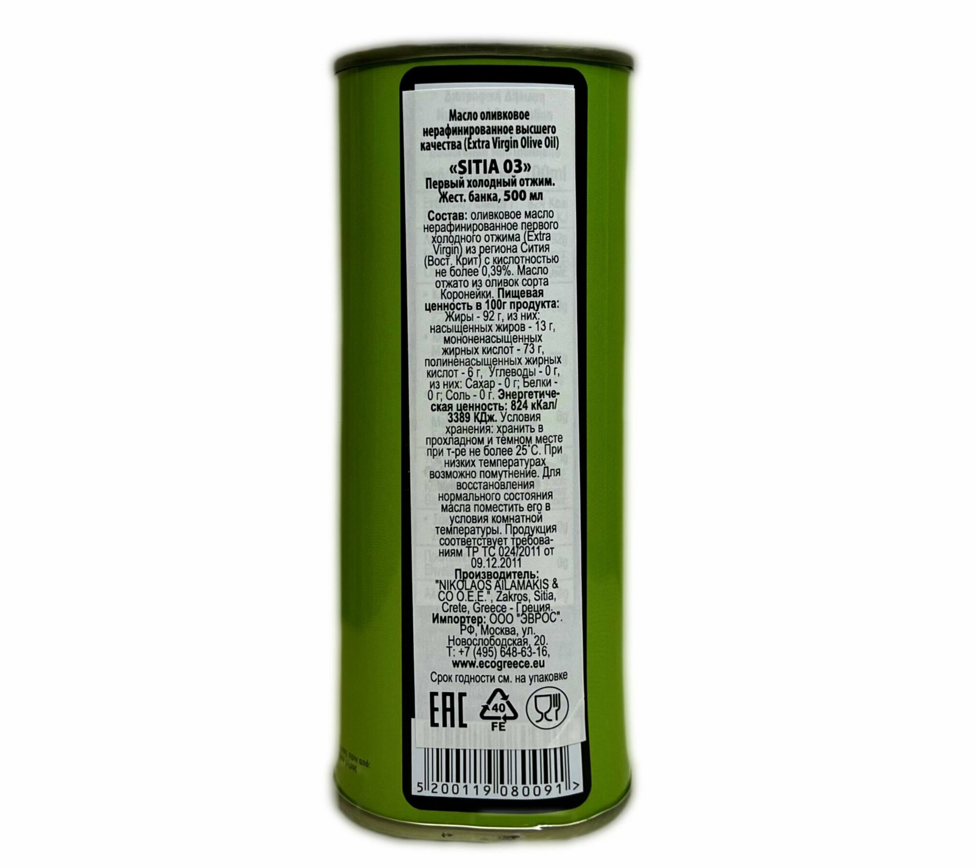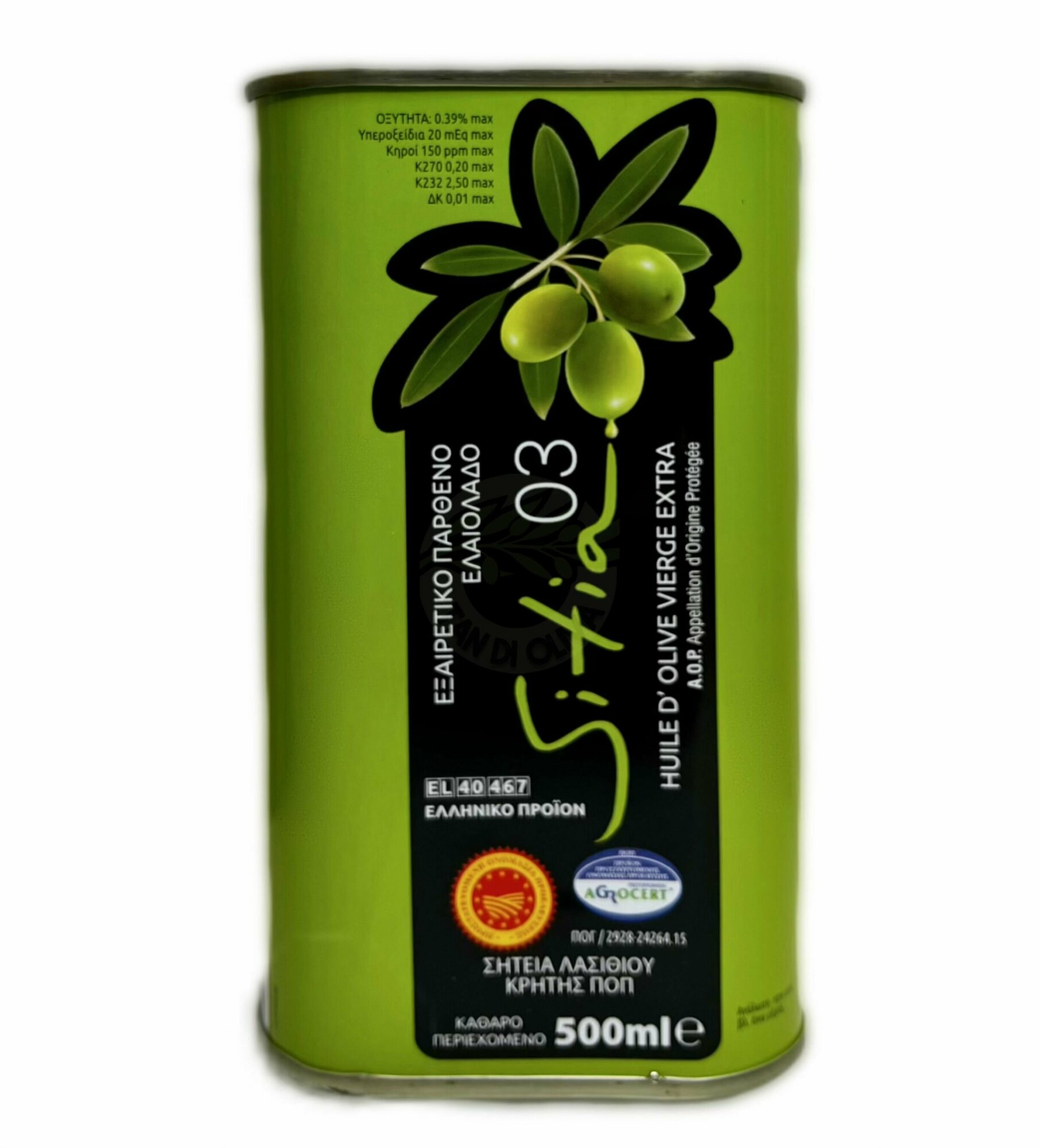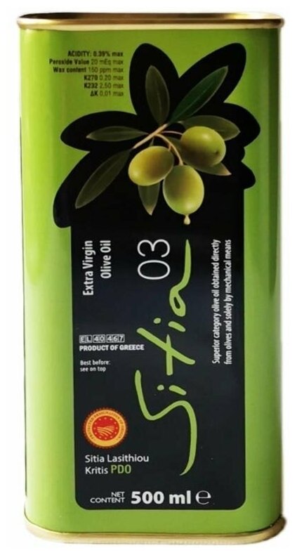 Оливковое масло Sitia имеет природную низкую кислотность не более 0,29%, сохранив все полезные вещества накопленные созревшими плодами олив сорта Коронейки произрастающих в регионе Сития (Восточный Крит), где насчитывается более 3000 солнечных часов в году!Это исключительно благоприятное географическое местоположение, с климатом и почвой идеально подходящими для производства оливкового масла самого наивысшего качества. Сития 0,3 имеет очень низкую кислотность – 0.3%, такое масло на Средиземноморье считается очень полезным и даже целебным, оно является гастрономическим продуктом, который богат антиоксидантами и обладает множеством полезных свойств. Оливковое масло имеет нежный золотисто-зелёный цвет и приятный горько-сладкий фруктовый аромат. Сбалансированный слегка сладковатый вкус с перчинкой в продолжительном послевкусии характерен для свежего оливкового масла. Сдержанный аромат диких горных трав с нотками душистого перца, это высочайшего качества оливковое масло – правильное дополнение вашим салатам и легким блюдам. Обладает уникальным фруктовым ароматом и удивительно продолжительным послевкусием.Оливковое масло Sitia добывается из высоко ценимой оливки Koroneiki и отжимается на местном греческом производстве в тот же день после сбора. Процесс извлечения оливкового масла из плодов оливы проводится непосредственно в день сбора урожая при очень низких температурах, чтобы сохранить все полезные качества и очень низкую кислотность. Процедура проходит под строжайшим контролем специалистов. Коронейки – мелкие зеленые оливки, которые не используются в пищу, а лишь только для отжима масла.Кроме прекрасного свежего вкуса, эти оливки обладают очень важной особенностью - масло из них стабильно сохраняет все витамины и низкую кислотность на протяжении всего срока годности. А низкая кислотность - это один из показателей высокого качества оливкового масла. AILAMAKIS - это фамилия, принадлежащая семье критского фермера Николаоса Айламакиса, который владеет оливковыми рощами и небольшим производством оливкового масла. В Греции принято ставить свою фамилию на производимый продукт как гарантию стабильно высокого качества, за который отвечает не только сам фермер, но и вся его большая семья. В традиционном укладе Крита репутация семьи играет определяющую роль для признания обществом и успеха в бизнесе. Семья Айламакис в течение нескольких поколений специализировалась на производстве этого жидкого золота и знает секреты получения оливкового масла Extra Virgin лучше, чем кто-либо. Protected Designation of Origin (P.D.O.) from Sitia of Crete. Обозначение на этикетке PDO Sitia Lasithiou Kritis (P. D. O. – знак защищенного наименования места происхождения) означает, что это масло произведено в регионе Сития острова Крит. Сития - один из самых известных в мире регионов, производящих оливковое масло высшего качества. Продукты получают знак PDO, потому что они имеют специфические региональные характеристики и производятся специальными традиционными методами.