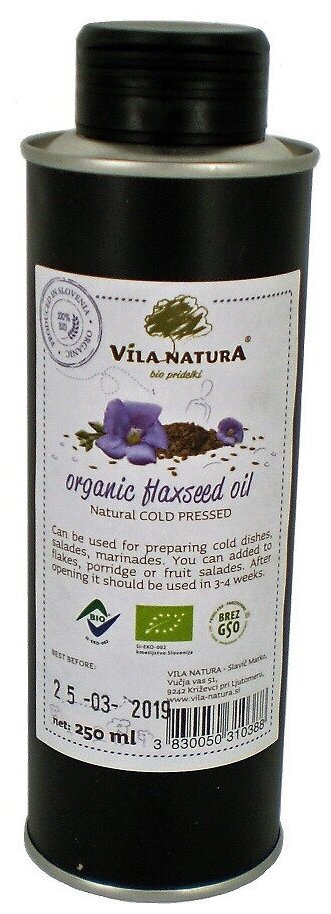 Сертифицированный продукт био органического земледелия произведено под контролем SI-EKO-002. Состав: 100% масло льняное. Изготовлено методом холодного прессования. Не рафинированное. Не дезодорированное. Попробуйте одно из самых полезных масел в мире за счет высокого содержания полезных omega3 жирных кислот в его составе. льняное масло высоко ценят за его богатый состав и полезные свойства. Наше масло сделано методом холодного прессования. данный способ изготовления позволяет получить высококачественный продукт, но гораздо более затратен по сравнению с современными способами производства. Рекомендации по использованию: употреблять в качестве заправки салатов, а также уже приготовленных блюд и салатов. после вскрытия постарайтесь использовать масло в течение нескольких недель. Продукт упакован в бутылку из темного стекла, такая упаковка максимально хорошо сохраняет продукт от воздействия света и окисления. емкость 250мл. Срок годности 18 месяцев. Пищевая/энергетическая ценность на 100г продукта 884 ккал. жиры-100г, в т. ч, насыщенные жирные кислоты-9,4г, мононенасыщенные жирные кислоты-20,2г, полиненасыщенные жирные кислоты-66,0г. Сделано в Словении.