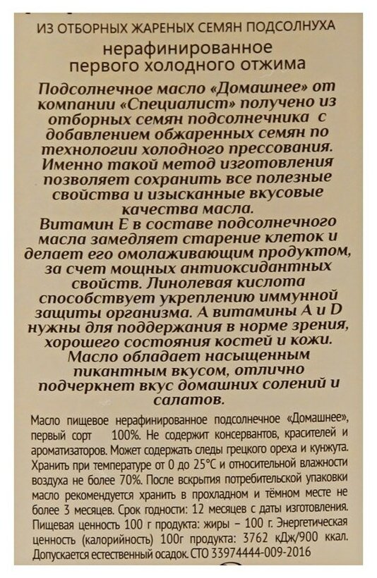 | Состав | Масло подсолнечное пищевое нерафинированное первого холодного отжима 100% первого сорта. |