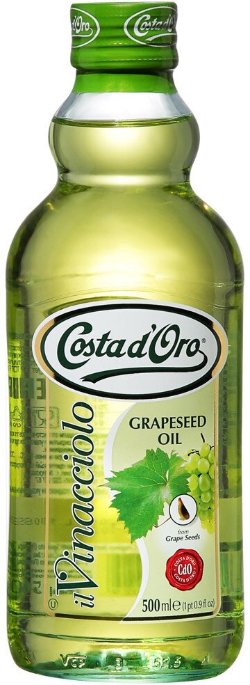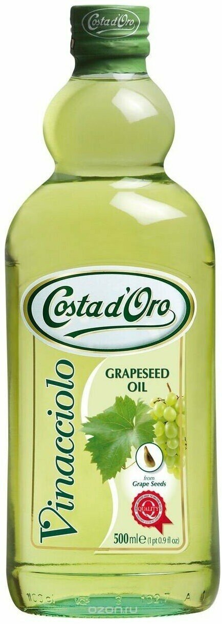 Масло Costa d`Oro из виноградных косточек 500мл Масло из виноградных косточек имеет пряный оттенок и лёгкий вкус, не меняет запаха и своих свойств при нагревании, поэтому идеально для жарки. Оно отлично подходит для салатов, маринадов, соусов, мясных блюд. Небольшое количество масла придает особый аромат пирожным, домашней выпечке и хлебу. Виноградное масло пользуется огромной популярностью, благодаря высокому содержанию витамина Е, линолевой кислоты и множеству других полиненасыщенных жиров. Состав: масло виноградное рафинированное 100%. Энергетическая ценность на 100 г: 900 ккал/3700 кДж. Срок годности: 2 года.