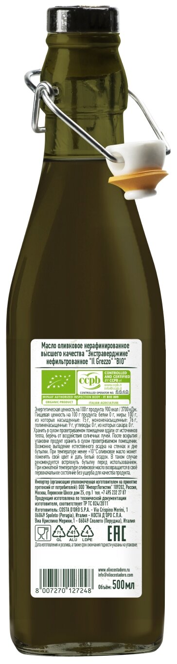 Оливковое масло Costa d'Oro il Grezzo Bio Extra Virgin нерафинированное нефильтрованное 500 мл