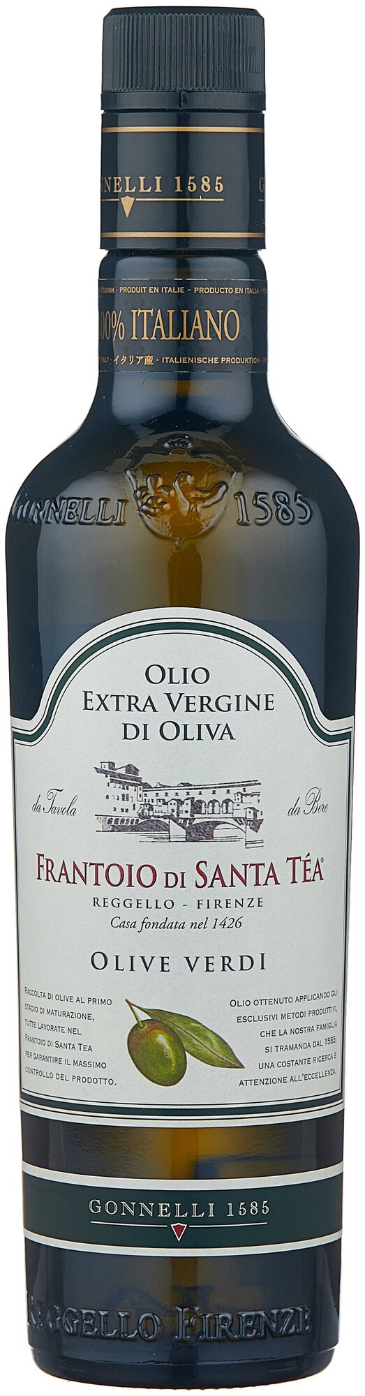 Оливковое масло категории Extra Vergine изготовлено по семейному рецепту из зеленых оливок сорта Франтойо и Морайоло, собранных в ноябре. Обладает красивым зеленым цветом с оттенками золота, отличается деликатным ароматом артишока, свежей травы и зеленого лесного ореха, насыщенным вкусом с тонами специй.