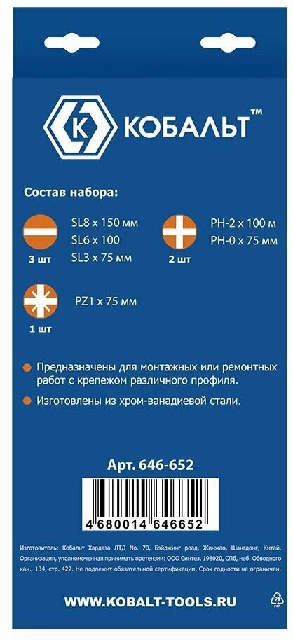 | Дополнительно в наборе | В наборе 6 отверток:SL8x150 мм, SL6x100 мм, SL3x75 мм, PH2x100 мм, PH0x75 мм, PZ1x75 мм. |