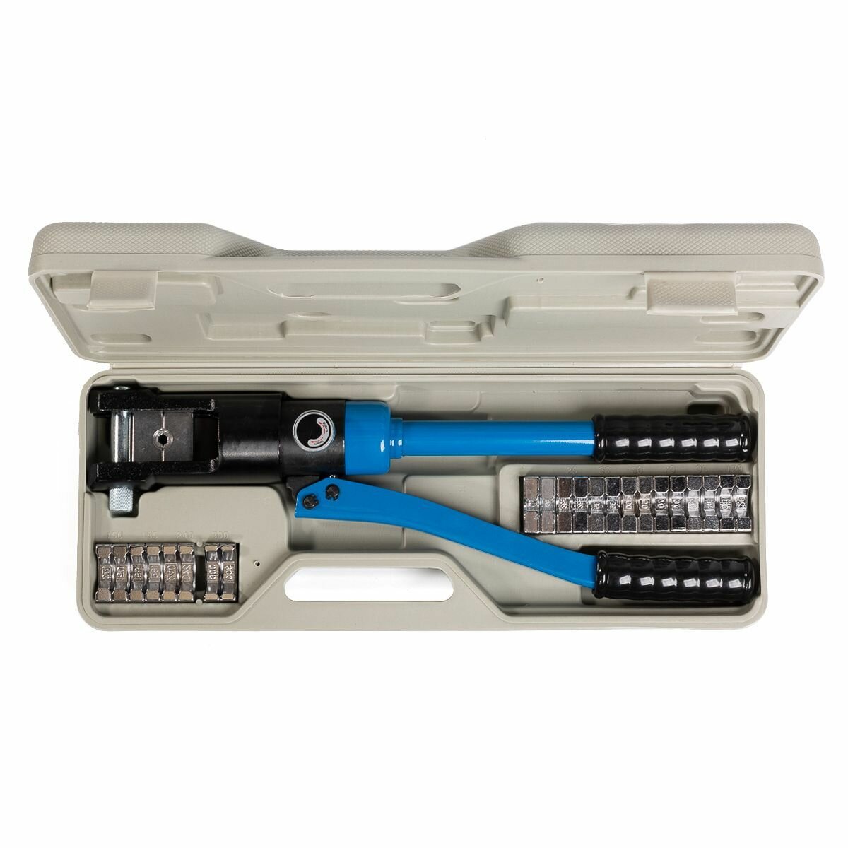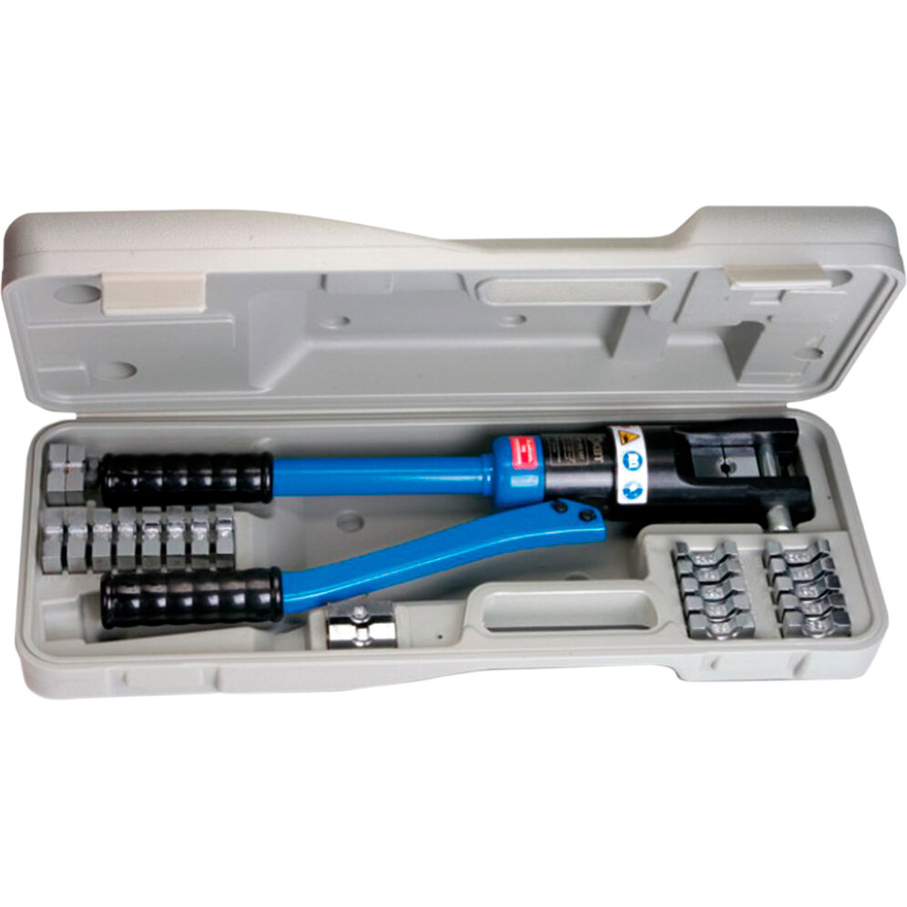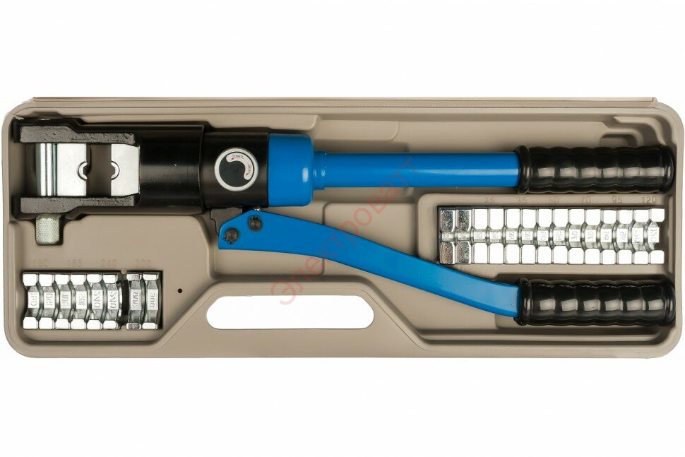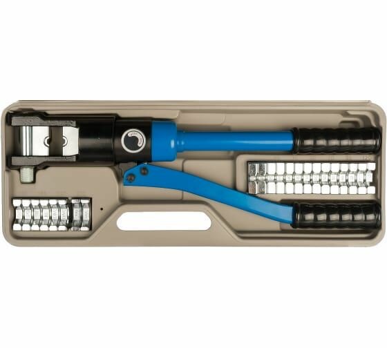 | Комплектация | Пресс гидравлический, набор из 12 сменных матриц, прочный пластиковый кейс, ремкомплект (уплотнительные кольца) |