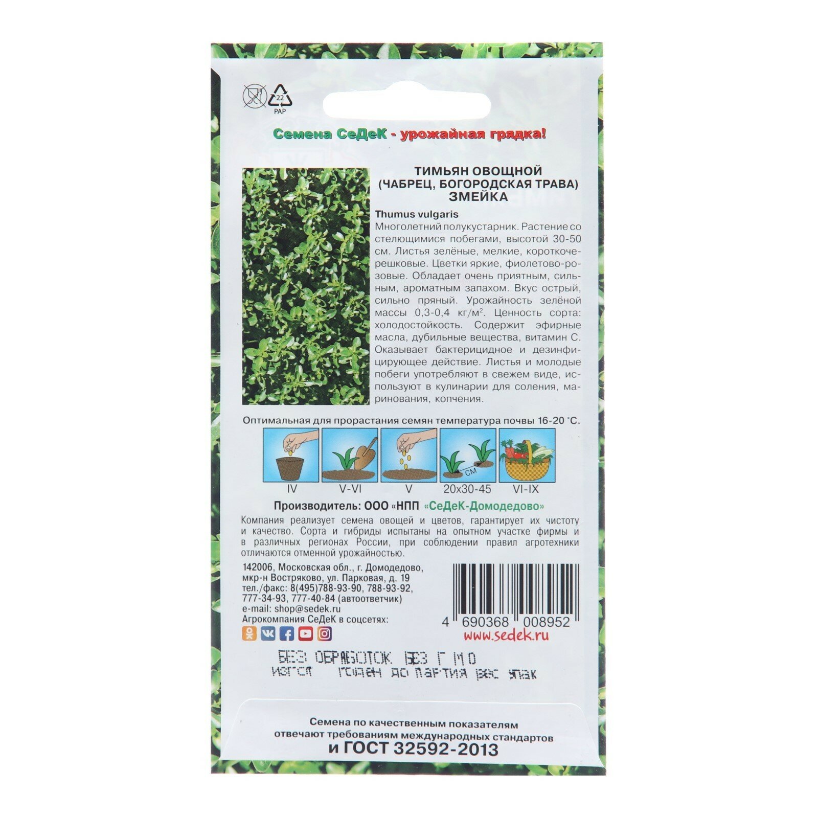 Сервис сравнения цен СкидкаГИД предлагает сравнить цены на товар «Семена пряных трав и салатов СеДеК Тимьян СеДеК овощной Змейка 0,05 г»