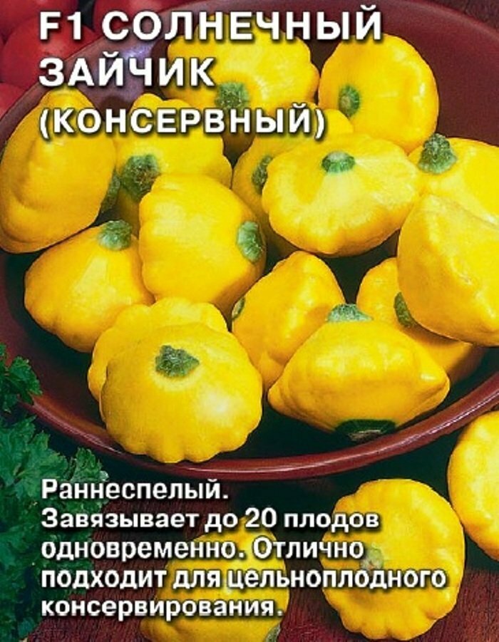 Раннеспелый (42-45 дней) гибрид. Растение мощное, кустовое, облиственное, с преимущественно женским цветением и обильным плодоношением. Практически одновременно завязывает и формирует до 20 плодов. Плоды ярко-жёлтые, небольшие, дисковидные, ребристые по краю, массой 150-250 г, с плотной, кремовой мякотью. Урожайность 5,5 кг/м2. Ценность гибрида: устойчивость к мучнистой росе, высокая завязываемость и дружное формирование плодов, пригодность для массовых сборов мелких завязей для цельноплодного консервирования. Рекомендуется для использования в домашней кулинарии и консервирования.