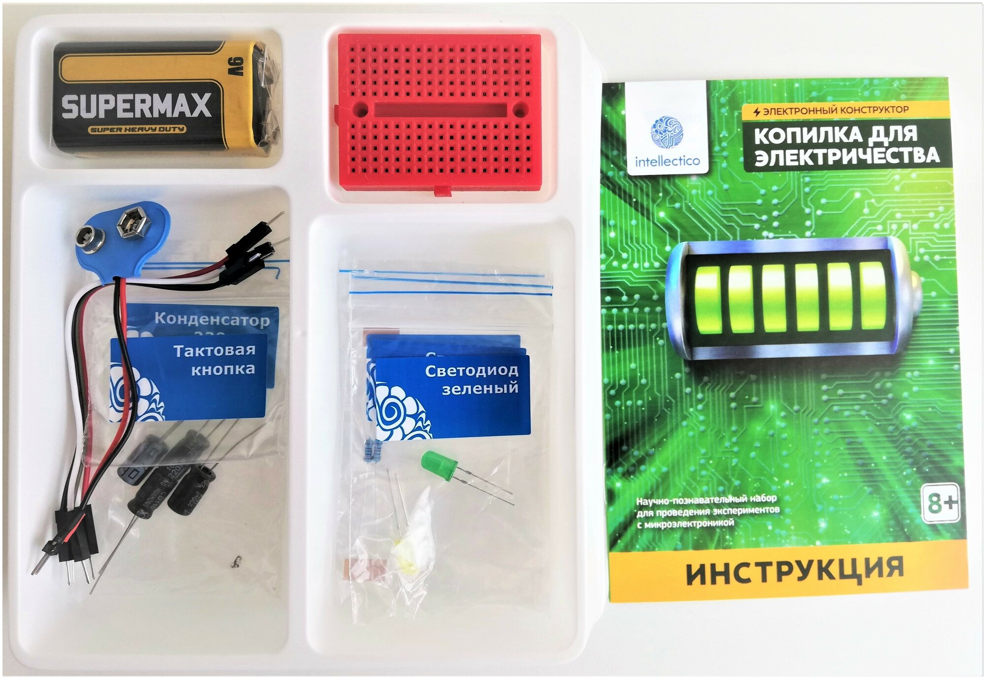 С набором «Копилка для электричества», юному исследователю предстоит собрать модель конденсатора, изучить принцип его работы, узнать об использовании его в повседневной жизни. Воспользовавшись свойством конденсаторов запасать и отдавать электрическую энергию, ребенок сможет собрать простую конструкцию для хранения электроэнергии. В наборе 3 опыта с микроэлектроникой.