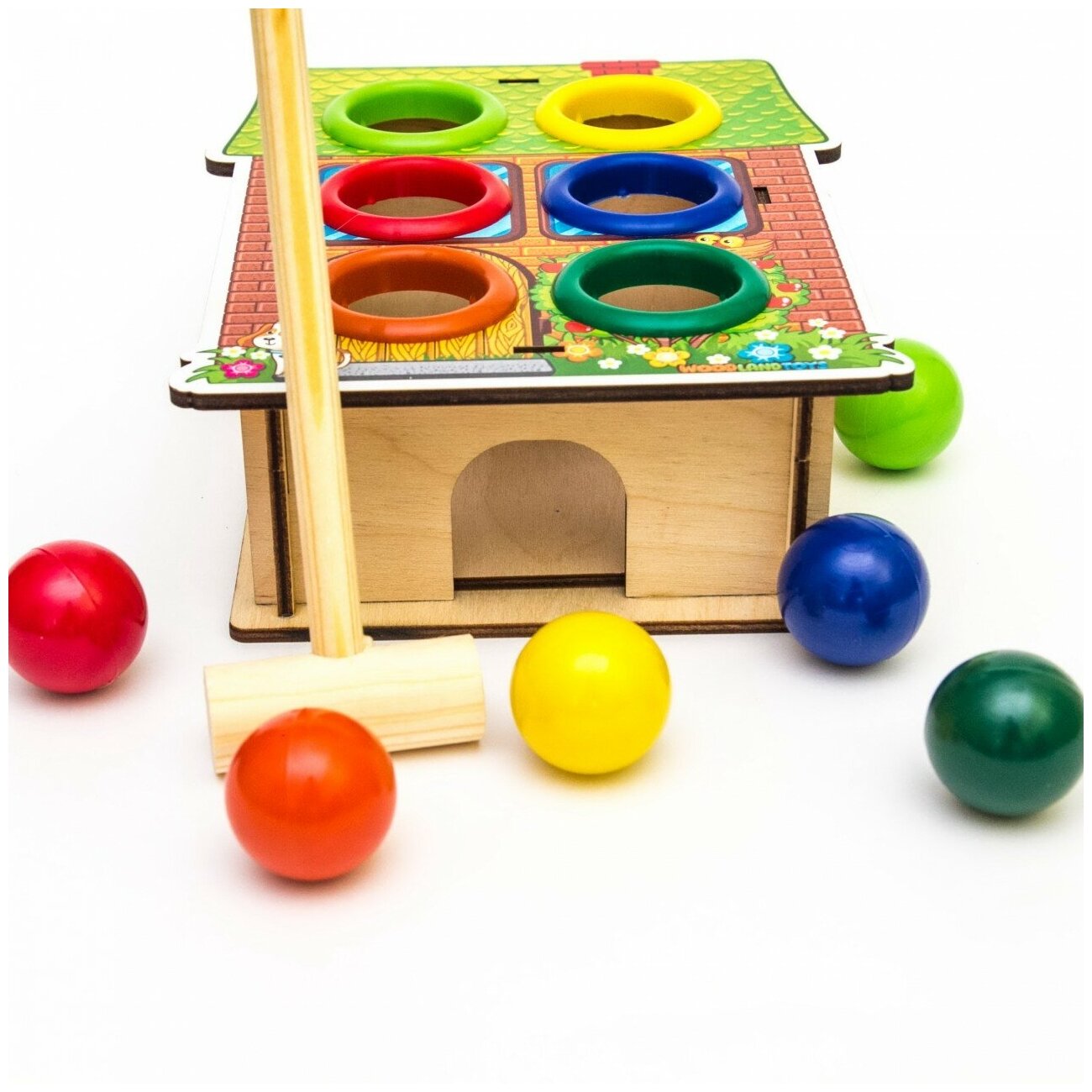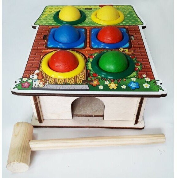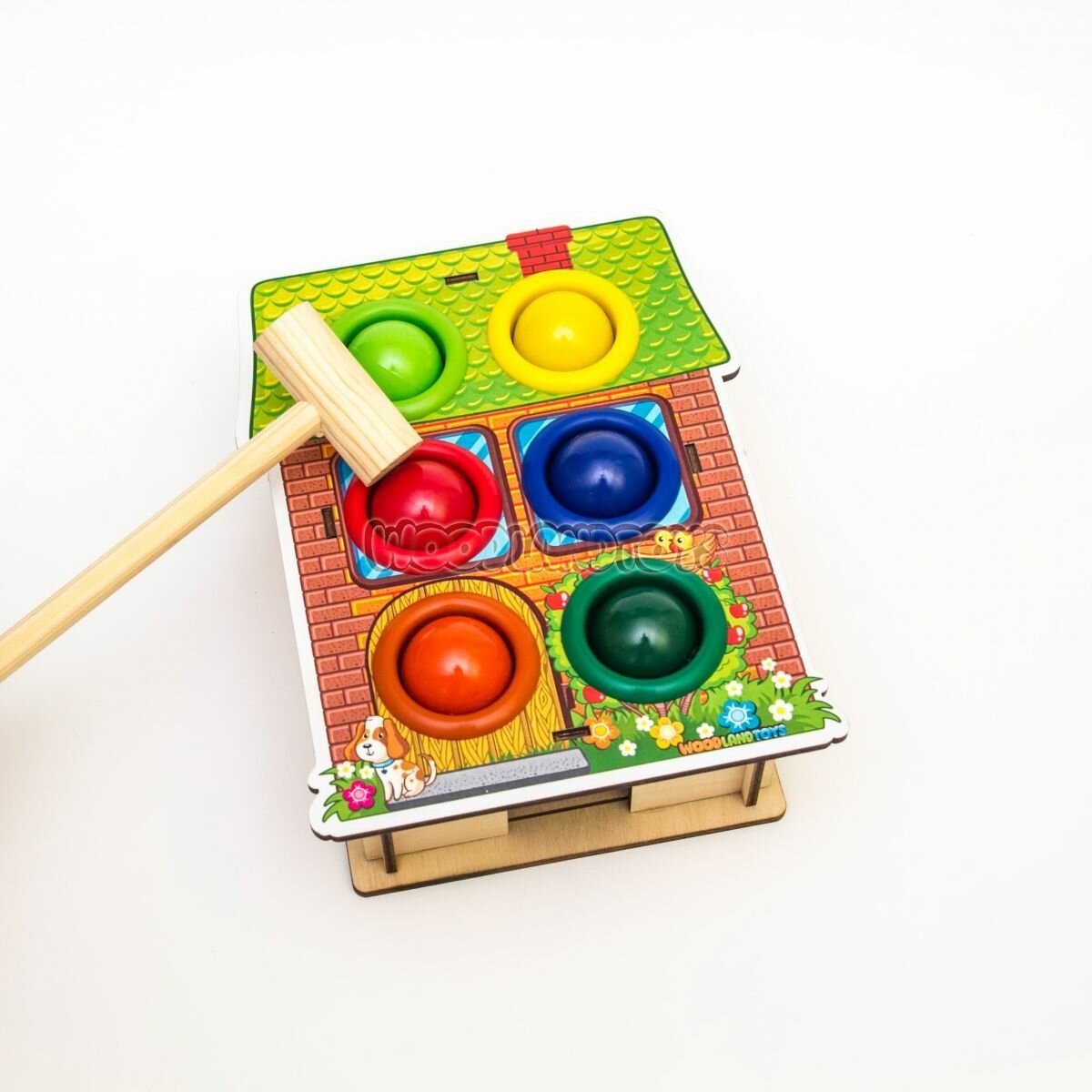 Цветная стучалка «Дом» - это игрушка, направленная на развитие ловкости, меткости, сноровки и координации движений. Игровое поле оснащено 6-ю круглыми отверстиями, в которые малышу предстоит забить при помощи молотка разноцветные шарики.