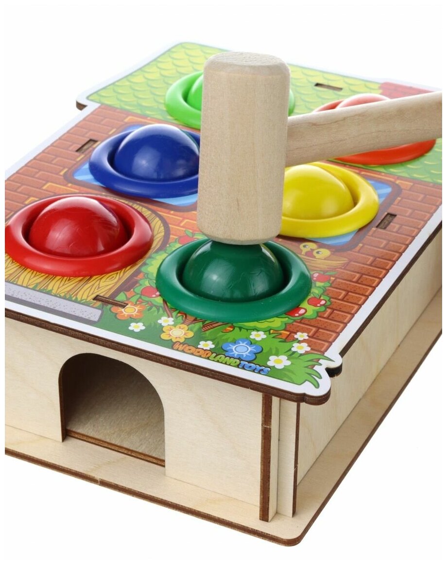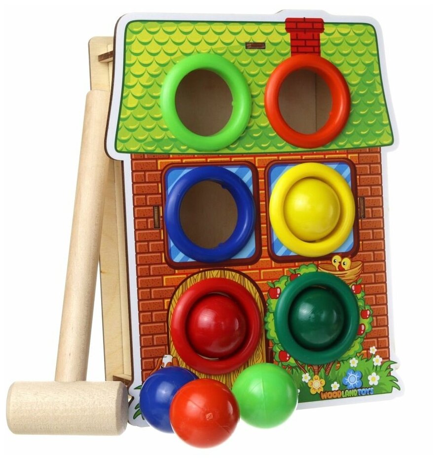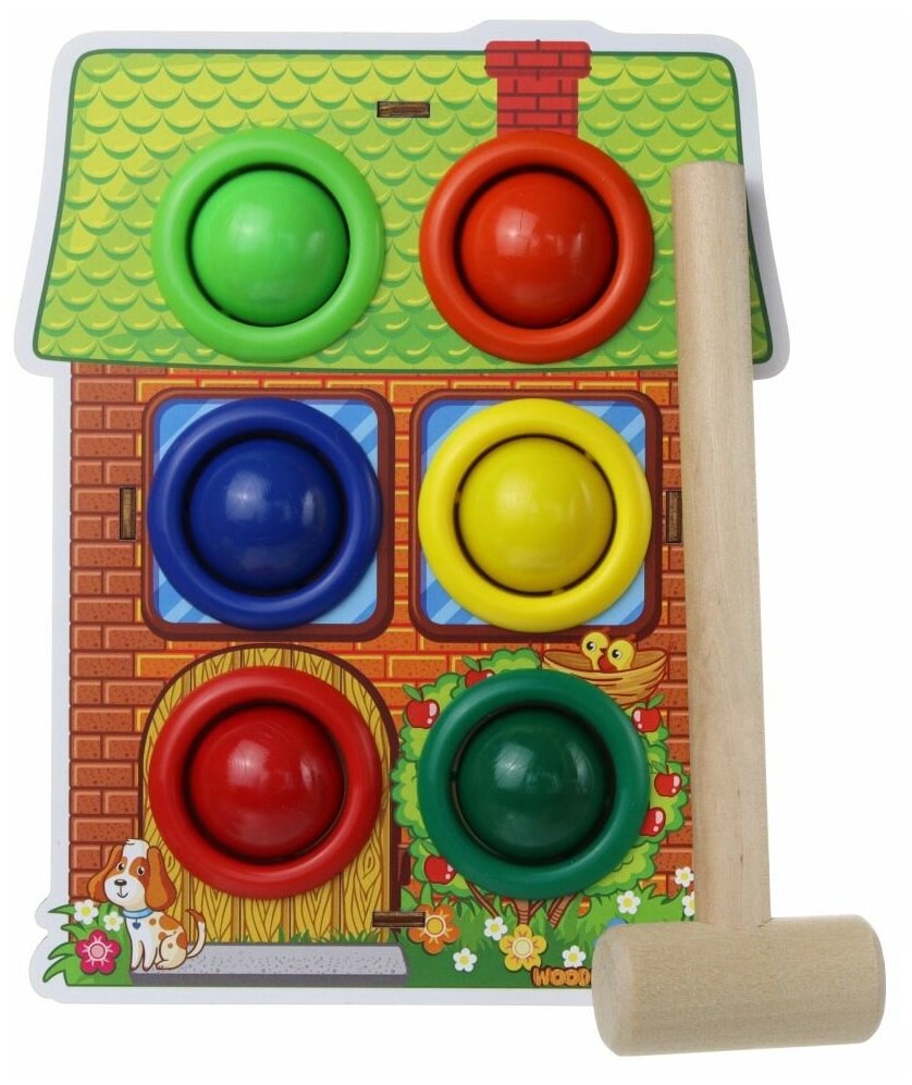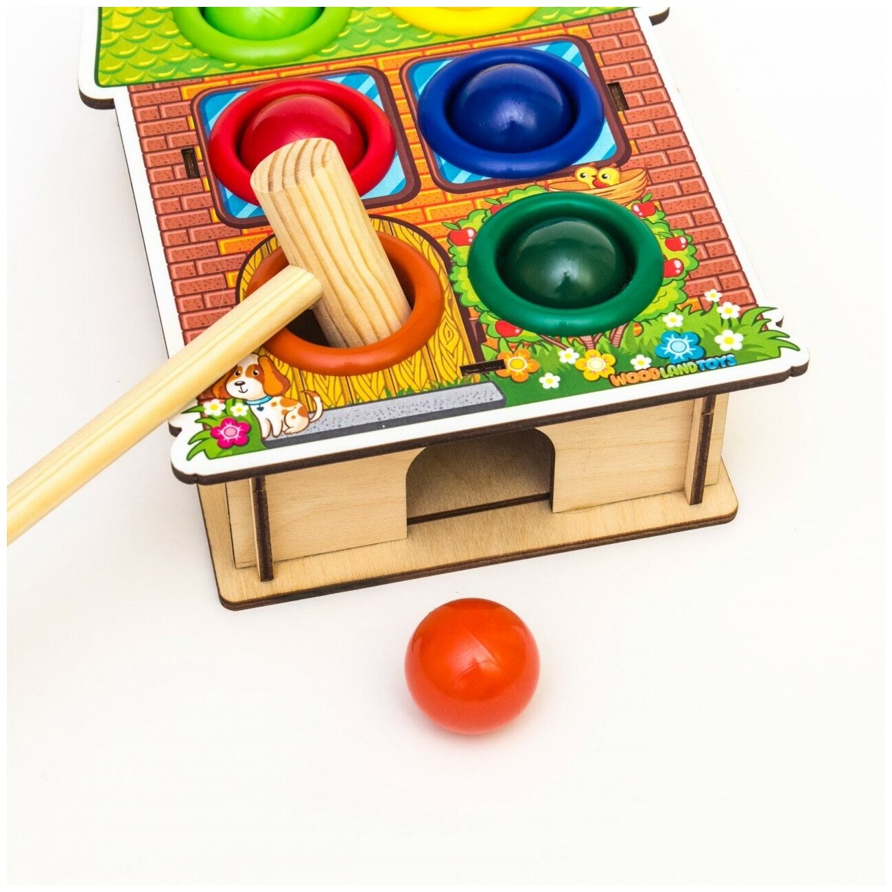 Цветная стучалка «Дом» - это игрушка, направленная на развитие ловкости, меткости, сноровки и координации движений. Игровое поле оснащено 6-ю круглыми отверстиями, в которые малышу предстоит забить при помощи молотка разноцветные шарики.