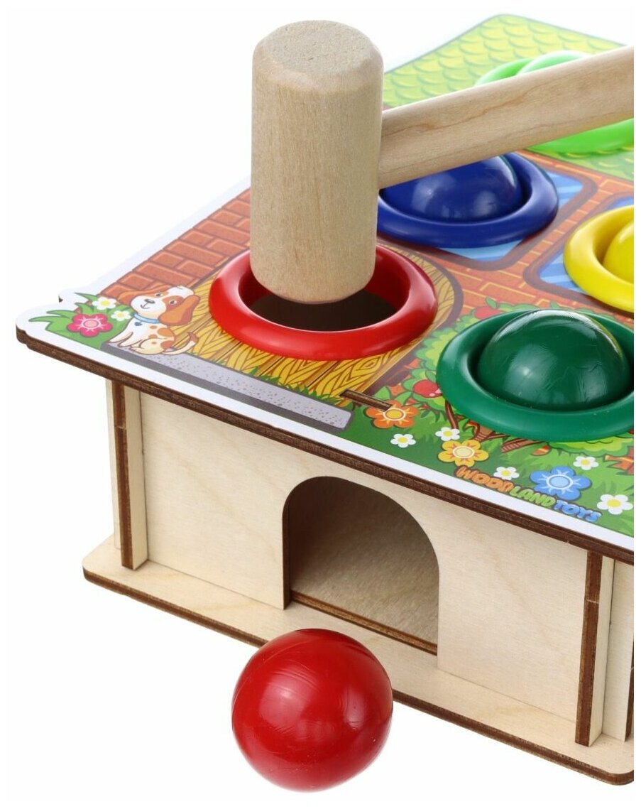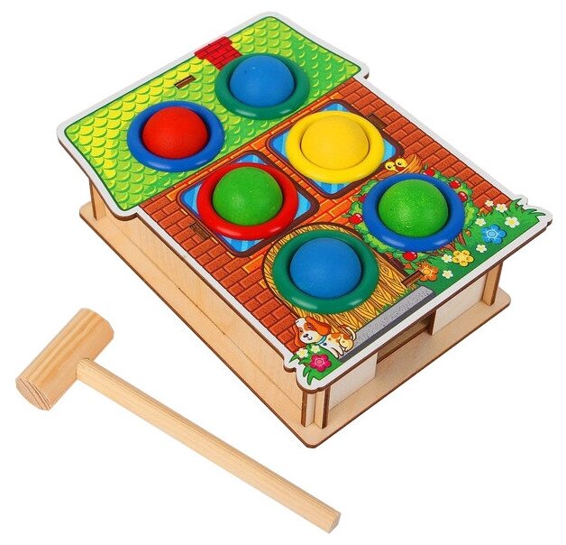 Задача ребенка — раскладывать в отверстия по цвету шарики, воздействовать на них рукой или молоточком и ловить, когда они выкатываются из специального бокового отверстия.