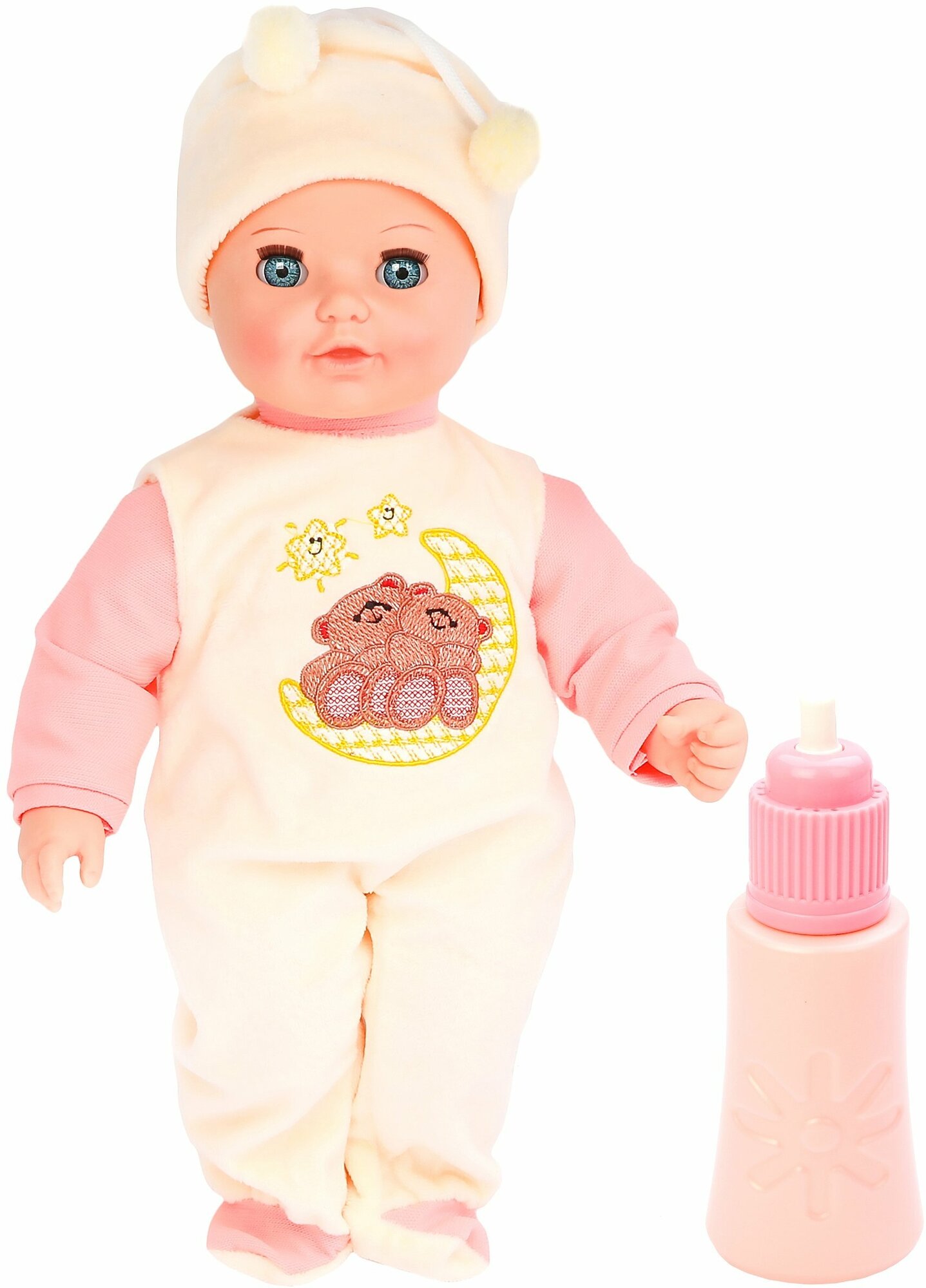 Кукла «Саша 8» - это кукла с набивкой из экологически чистых материалов. У пупса очаровательное милое личико, а его мягкая одежда украшена забавным рисунком. Пропорции игрушечного малыша очень верные и правильные, это делает его образ более гармоничным. Кроме того, бутылочка куклы оснащена звуковыми эффектами - когда она расположена возле рта пупса, то при нажатии будет издавать звуки детского плача.