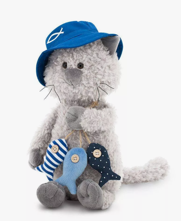 Этот кот с забавным именем Обормот обожает рыбачить, поэтому и в этот раз он несет свой небогатый улов, прикрыв голову от солнца яркой панамкой. В это чудо невозможно не влюбиться, поэтому смело дарите мягкую игрушку ребенку, а он уж сам легко придумает сюжет игры со своим новым другом.