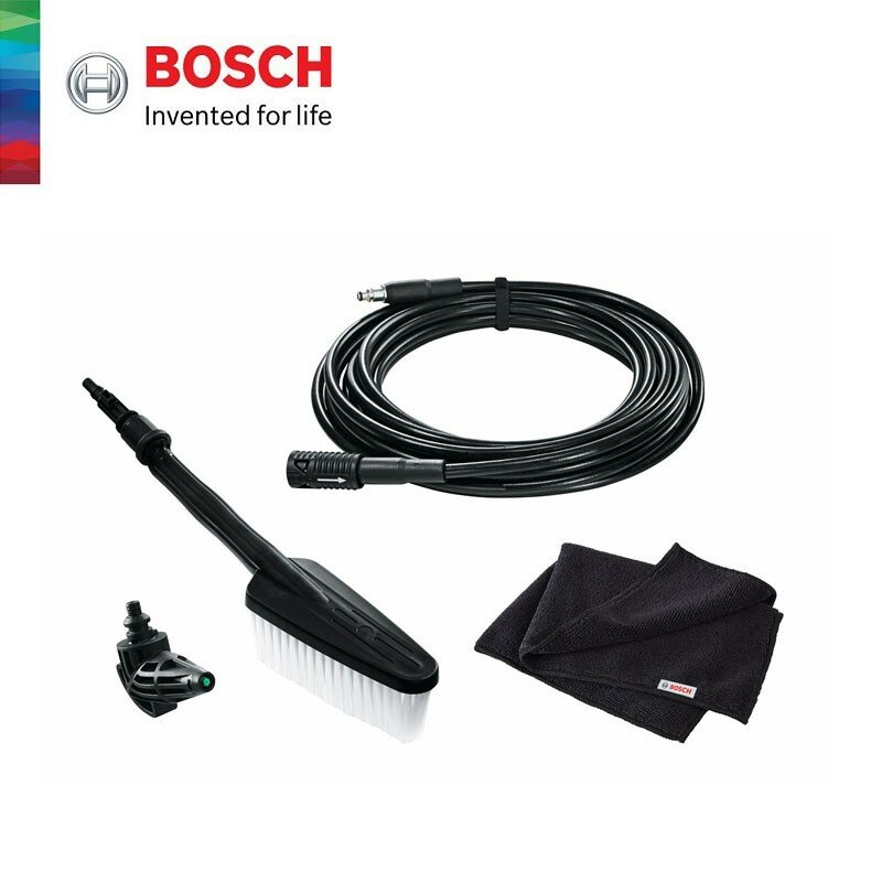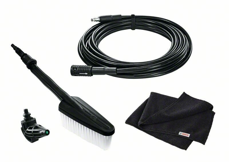 В набор Bosch Set включены аксессуары для эффективной и быстрой мойки автомобиля с помощью очистителей высокого давления. В комплекте щетка, угловая насадка-сопло, 6-метровый шланг, полировальная ткань из микрофибры.