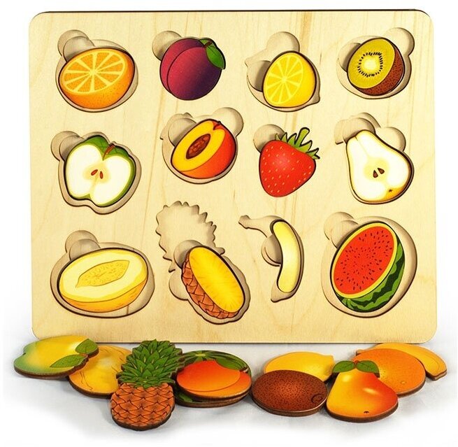 Многослойная рамка-вкладыш. Вынув верхние вкладыши, на которых изображены целые фрукты, можно увидеть, как фрукт выглядит внутри. Внутренние вкладыши также вынимаются. Для того, чтобы вкладыши было удобно вынимать сделаны специальные отверстия для пальца. Краска нанесена прямо на дерево, с помощью специального принтера. Благодаря чему, рисунок не отслаивается и игрушка будет долговечной.