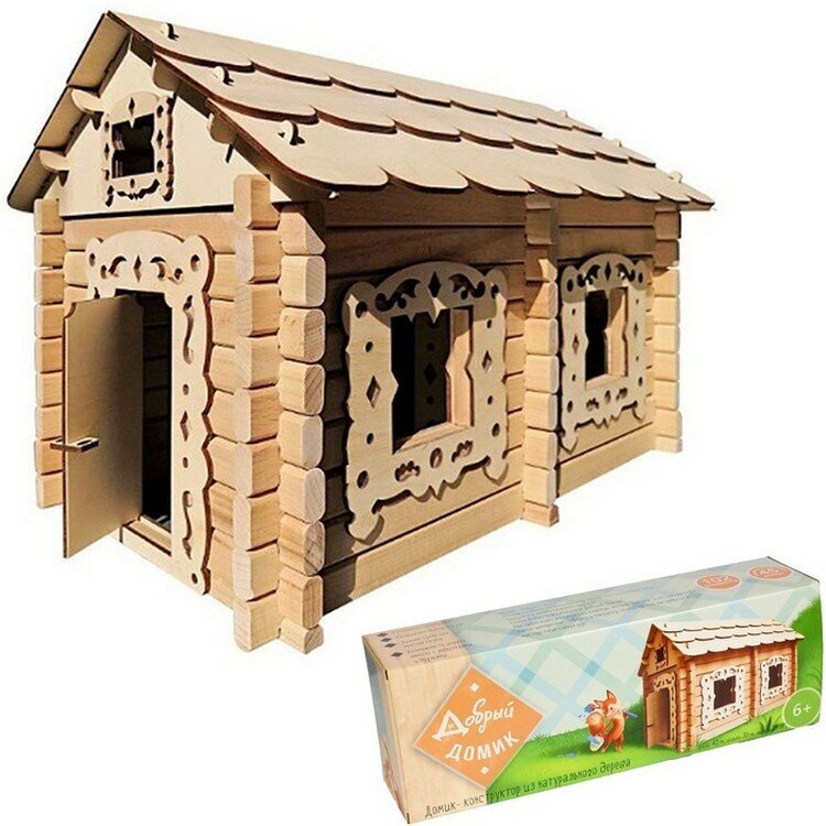 Домик-конструктор из натурального дерева. Привет, дорогой друг! Хочешь создать своими руками место, где поселятся твои игрушки и воображаемые друзья? Тогда добро пожаловать в Добрый домик! Мы заботливо изготовили каждую деталь домика, и оставили тебе самое интересное - сборку и покраску, чтобы ты мог насладиться мастерством своих рук. Добрый домик - развивает воображение, развивает моторику рук, лучшее средство против скуки, возможность играть вместе с родителями и друзьями.102 элемента, примерное время сборки - 45 минут. Комплектация: фронтон-2шт, балка-4шт, кровельный лист-6шт, наличник на фронтонное окно-2шт, полубрус-6шт, брус 41см-15шт, брус 25см-12шт, брус 7.1см-24шт, брус 5.6см-6шт, брус 8см-3шт, наличник оконный резной-4шт, брусок для склейки окон 6.4см-4шт, наличник дверной-4шт, брусок для склейки дверей 12.7см-4см, дверное полотно-1шт, дверная ручка-1шт, клей ПВА(гипоаллергенный)-1 баночка 20мл, кисточка-1шт, акриловая краска-2 баночки по 20мл(в случае необходимости доаускается разбавить краску небольшим количеством воды. Размер упаковки: 43х10х15см, вес-2635г. Размер готового домика: 42х30х29см.