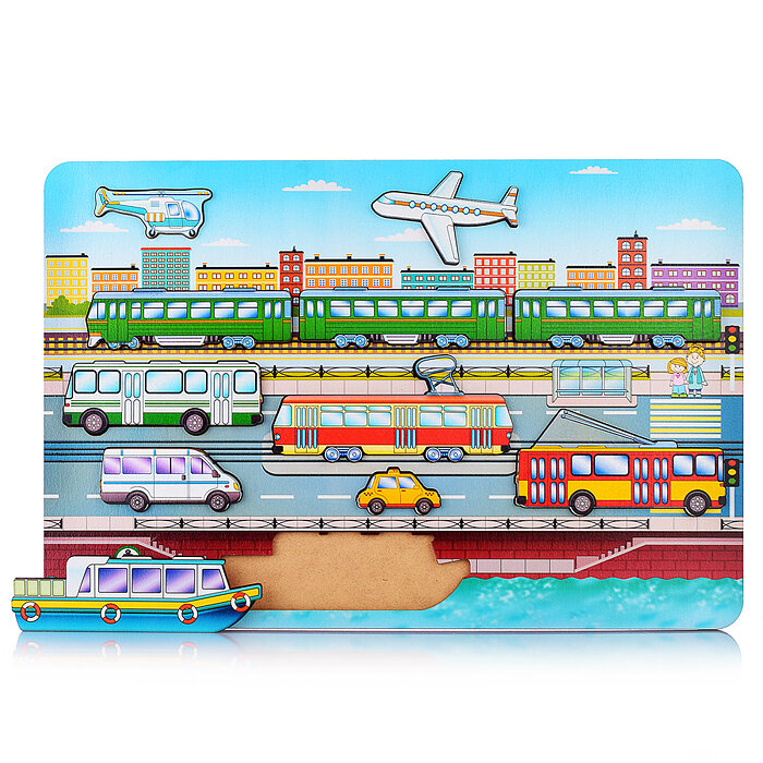 Классическая деревянная рамка с вкладышами. Вкладыши выполнены в виде разных видов пассажирского транспорта: вертолет, самолет, электричка (3 вагона), автобус, троллейбус, трамвай, такси, маршрутное такси, теплоход. Детали возвышаются над поверхностью доски, за счет этого их легко вынуть из основы. Рисунка под вкладышами нет.