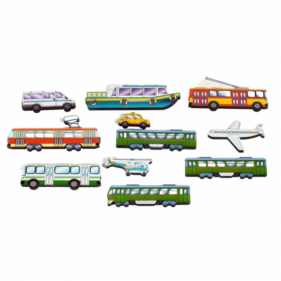 В комплект входит 11 красочных деталей, которые можно достать из ячеек и попросить малыша назвать их, а также спросить у него, чем самолёт отличается от вертолёта, а поезд от трамвая, какие транспортные средства являются наземными, какие водными, а какие воздушными. После этого ребёнку предстоит правильно разместить фигурки на игровой панели в соответствии с их контурами.