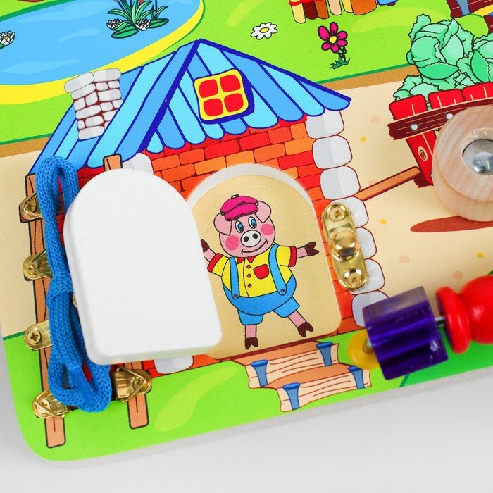 Развивающая доска бизиборд «Три поросёнка» – это обучающая игрушка по мотивам известной детской сказки. Бизибор имеет несколько домиков с открывающимися дверцами, подвижные шестерёнки и элементы вкладышей-пазлов. Все дверцы закрыты на разные безопасные замочки.