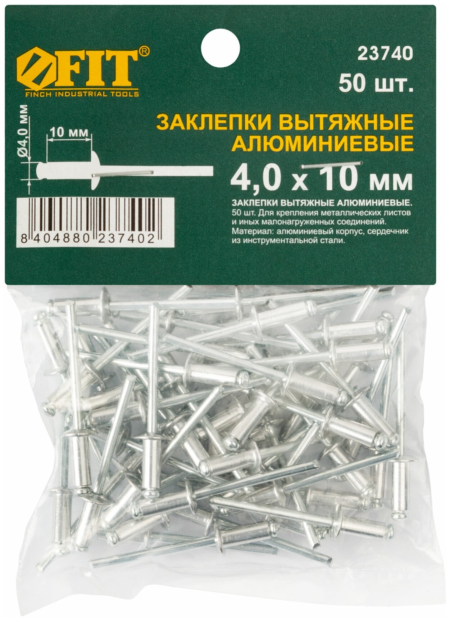 Заклепка FIT IT выполнена из алюминия и используется в комплекте с заклепочниками в качестве крепежа. С помощью заклепок создается неразъемное соединение из нескольких слоев материала, будь то металлические листы, ДСП, картон и многое другое. Конструкция заклепки обеспечивает максимальную зажимную силу, благодаря чему позволяет скреплять между собой листы, имеющие бугристую и другую неровную поверхность. Все это гарантирует надежное скрепление листовых заготовок. Количество — 50 шт.